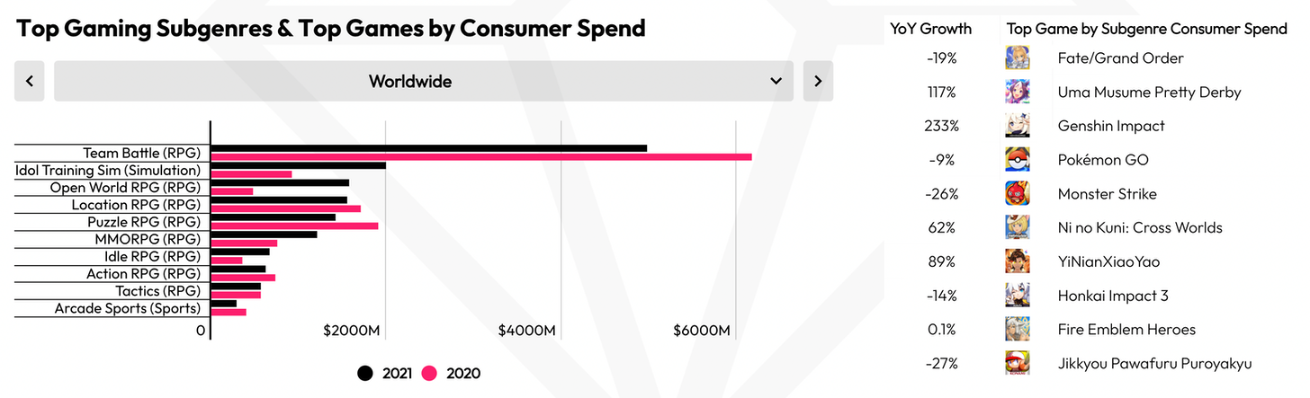 The Team Battle (RPG) genre is in the first place by revenue among anime-styled mobile games. They’re responsible for $4.9B. Open-world RPG in 2021 - thanks to Genshin Impact - grew by 233% in revenue.