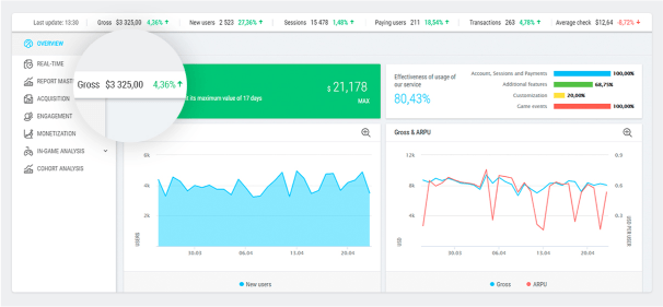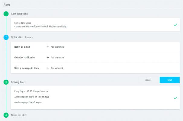 Enable smart alerts to keep track of metric fluctuations, and devtodev will alert you on Slack or email if any key metric is too high or too low.