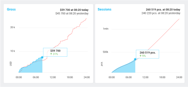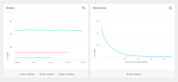 Track all kinds of user retention, including custom event retention and retention by 24-hour intervals, to understand user behavior with high accuracy and see the dynamics of different parameters when making changes in the product.