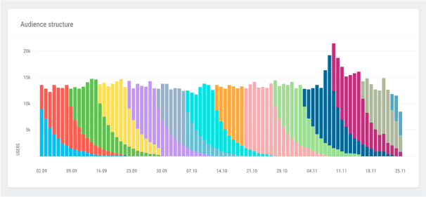 Evaluate DAU composition in the Audience Structure report to compare engagement and monetization of new and long-time users over time.