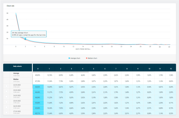 Reduce churn by identifying when and where users leave your app. The Churn Rate report shows daily churn percentages by cohort to help you pinpoint and address weak points.