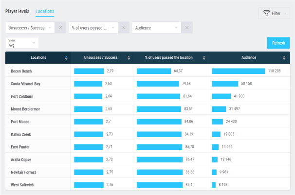 Identify game bottlenecks with out-of-the-box reports designed to analyze every aspect of the game and highlight its bottlenecks.