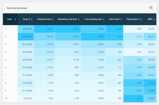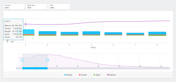 Get to know how users earn and spend virtual currency at each level to ensure a balanced in-game economy and improve player retention and paying share.