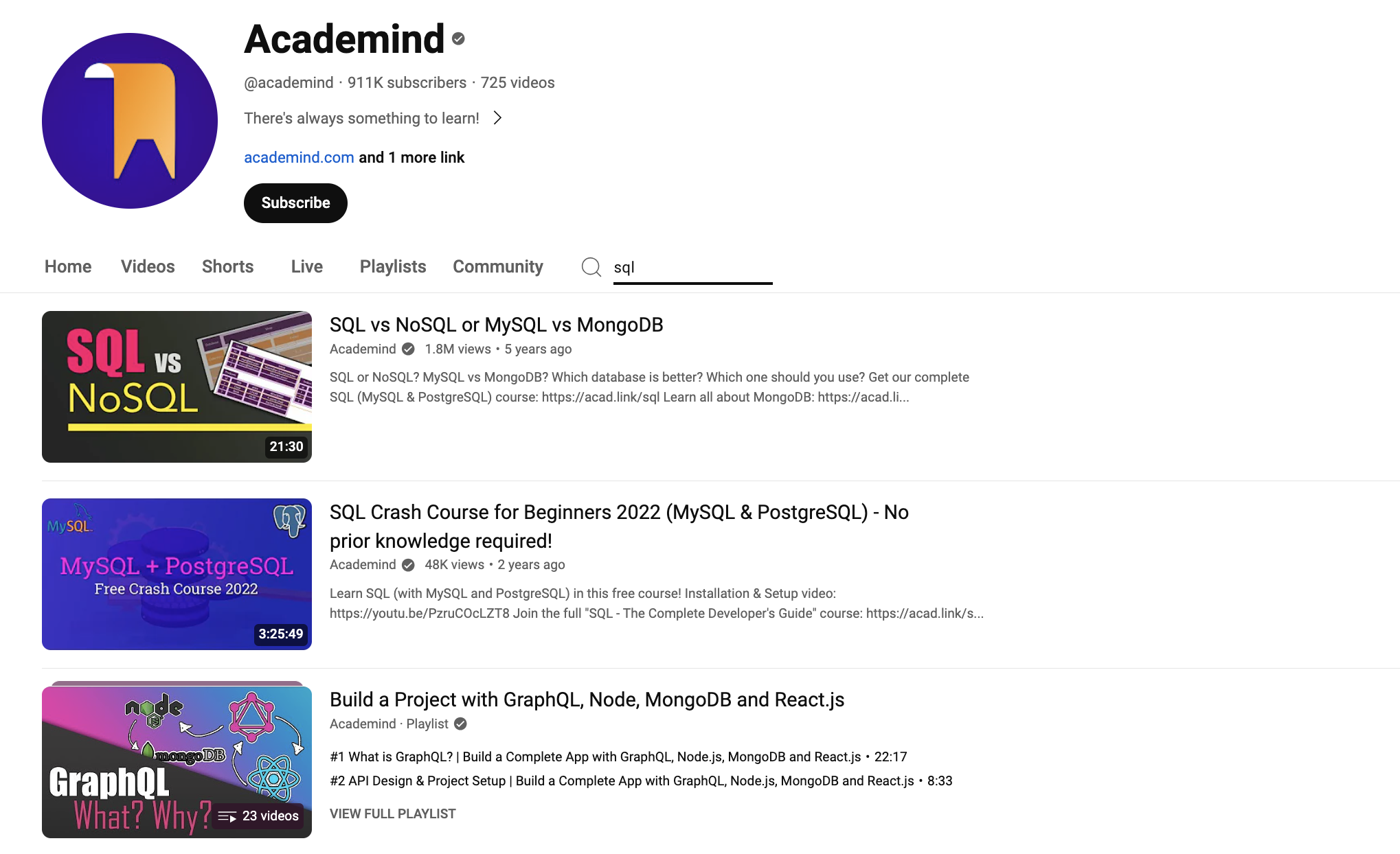 Academind offers high-quality tutorials on web development, programming languages, and software engineering. Their SQL tutorials cover a range of topics, from basic concepts to advanced techniques, making them suitable for learners at different skill levels.