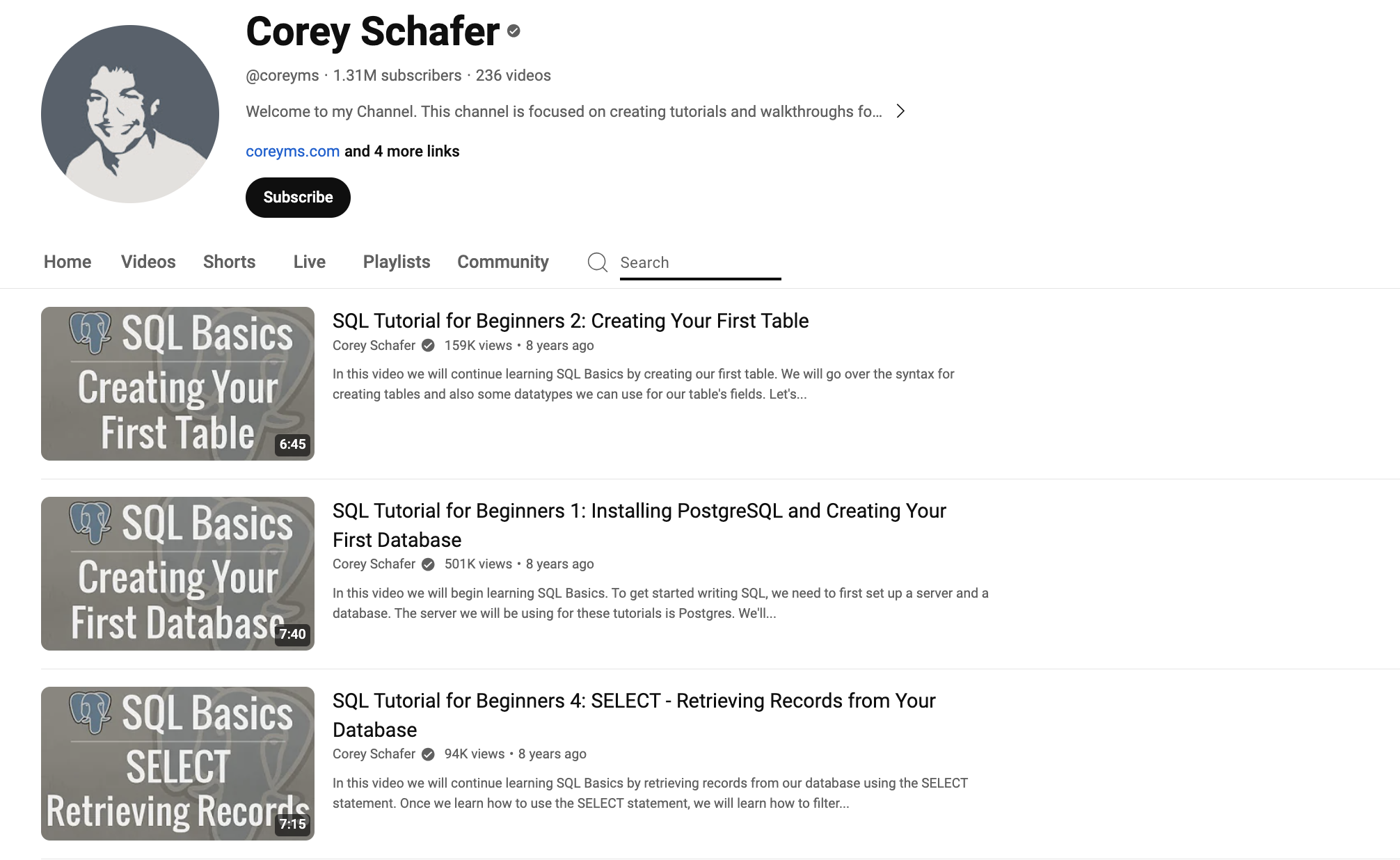 Corey Schafer's YouTube channel, known for its Python programming tutorials, also offers valuable resources for learning SQL. While Python remains his primary focus, Corey's SQL tutorials stand out for their clear explanations and practical examples. His systematic approach breaks down complex SQL concepts into manageable chunks, guiding viewers through each step of the learning process.