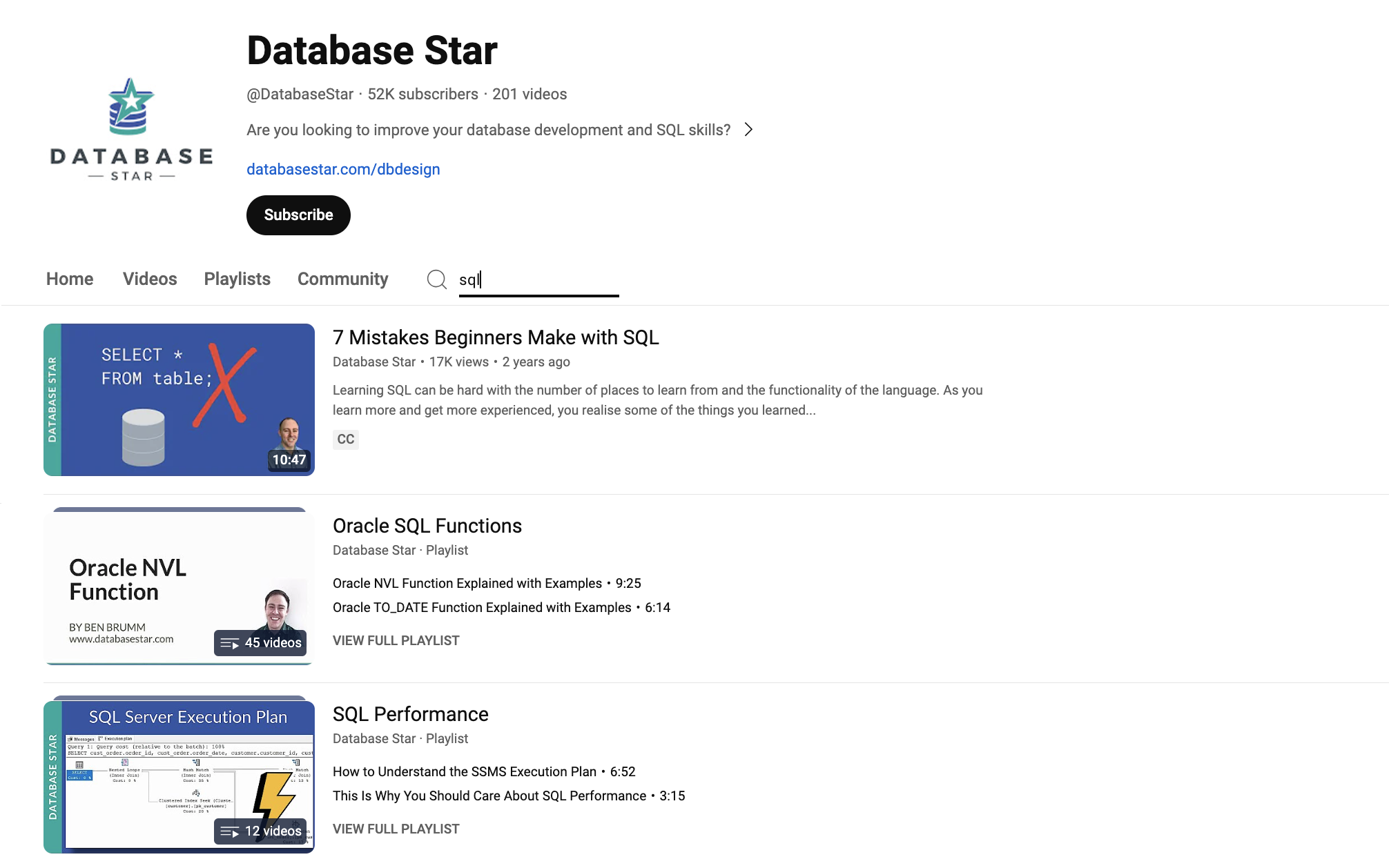 The Database Star channel, curated by Ben Brumm, reflects his experience and passion for database technology. With many years of experience as a database administrator and developer, Ben brings a wealth of practical experience to his guides. Database Star's content covers a broad spectrum of SQL tutorials, from fundamentals to advanced techniques.