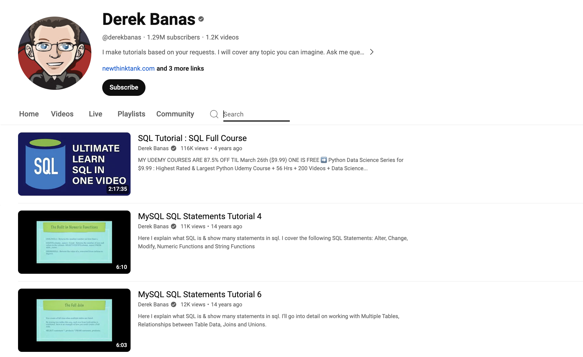 Derek Banas' YouTube channel covers a wide range of programming languages, including SQL. His tutorials contain concise and clear explanations, making them ideal for learners who prefer a fast-paced learning experience. Derek's SQL tutorials cover topics such as statements, databases, data types, and more.