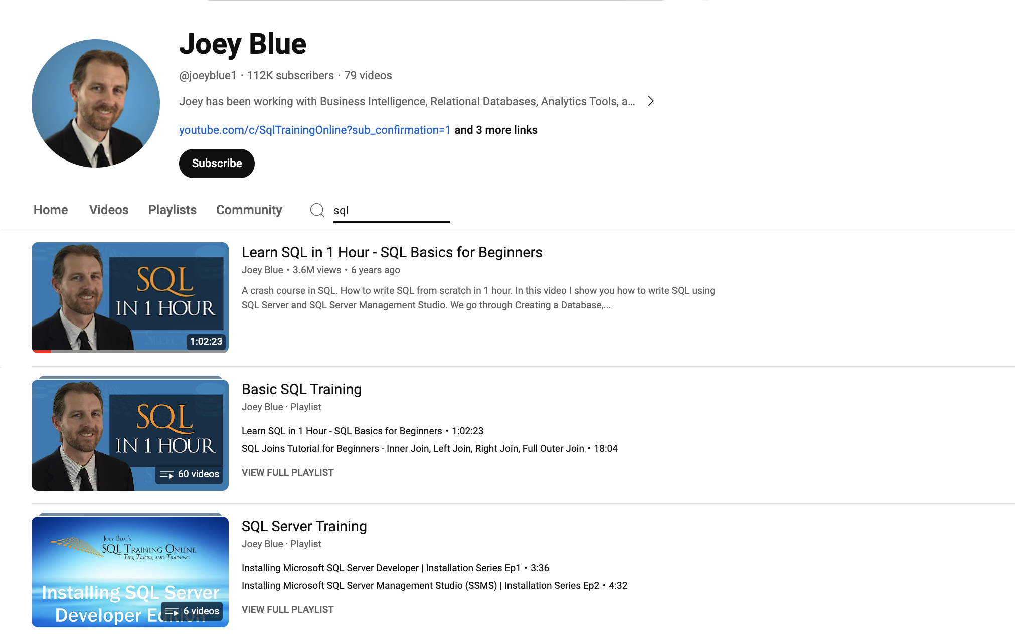 Joey Blue's YouTube channel is a treasure trove for anyone looking to master SQL. With over two decades of experience in business intelligence, relational databases, analytics tools, and reporting tools, Joey brings a wealth of knowledge to his tutorials. Joey's channel offers a comprehensive guide to various SQL techniques, supplemented by real-world project showcases.