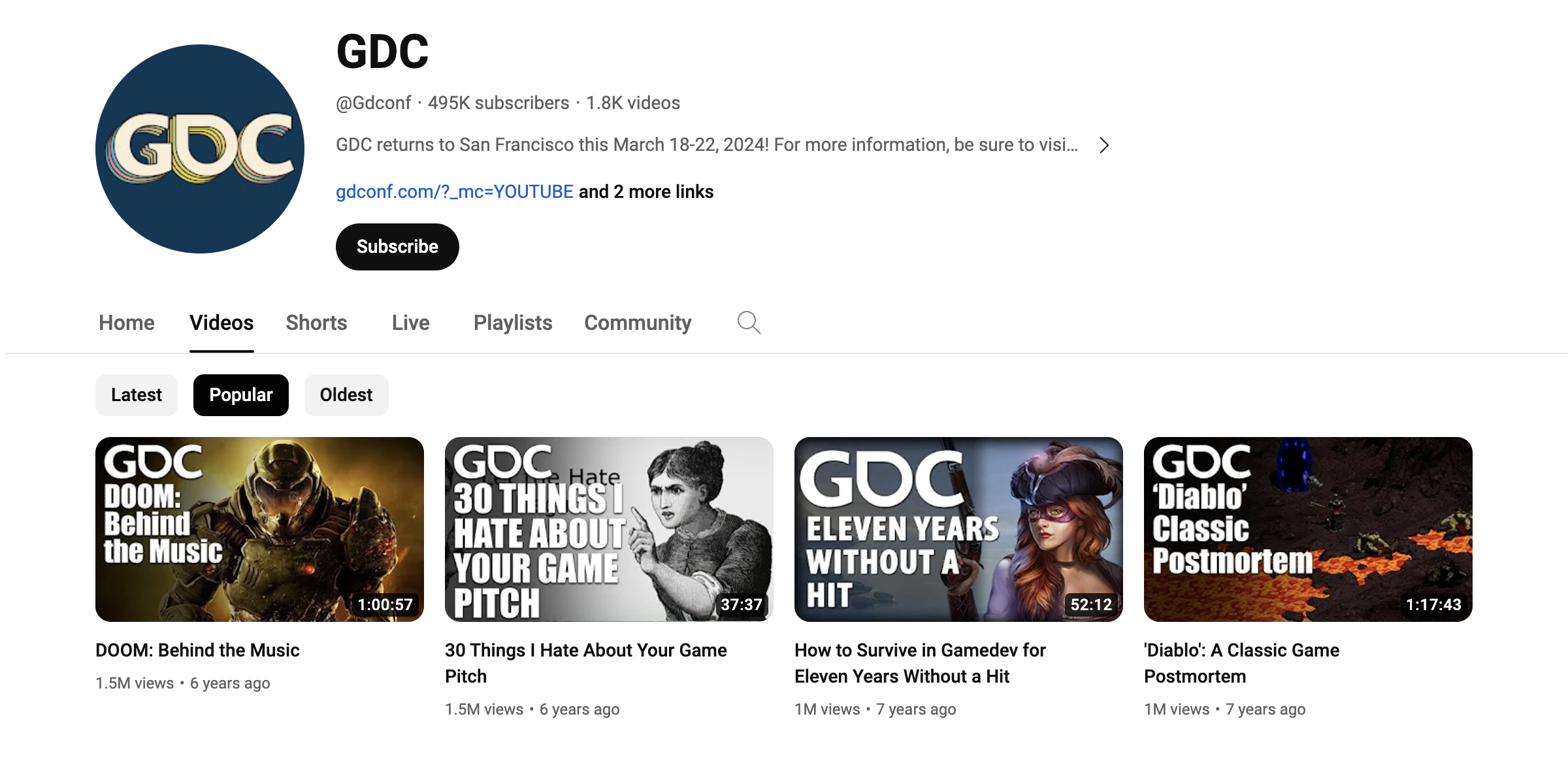 GDC (Game Developers Conference) is a well-known channel in the gaming industry. The channel covers topics related to game development, including programming, design, business, and marketing.