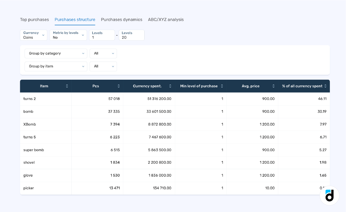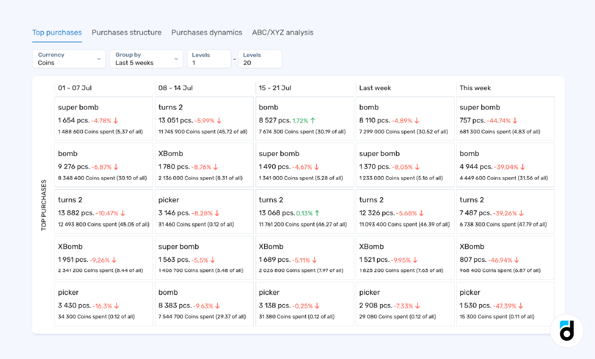 Understanding what items makeup players' shopping baskets and how these preferences change with their level is also crucial. For this, we turn to the Purchases Structure report.