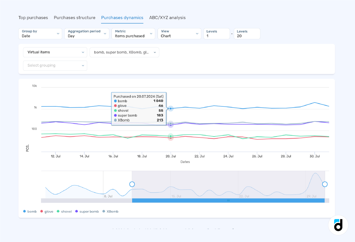 To begin with, we should examine the in-game currency and its spending and accumulation patterns. By using the Virtual Goods & Purchases report, we can identify the most popular items based on player levels and over time.
