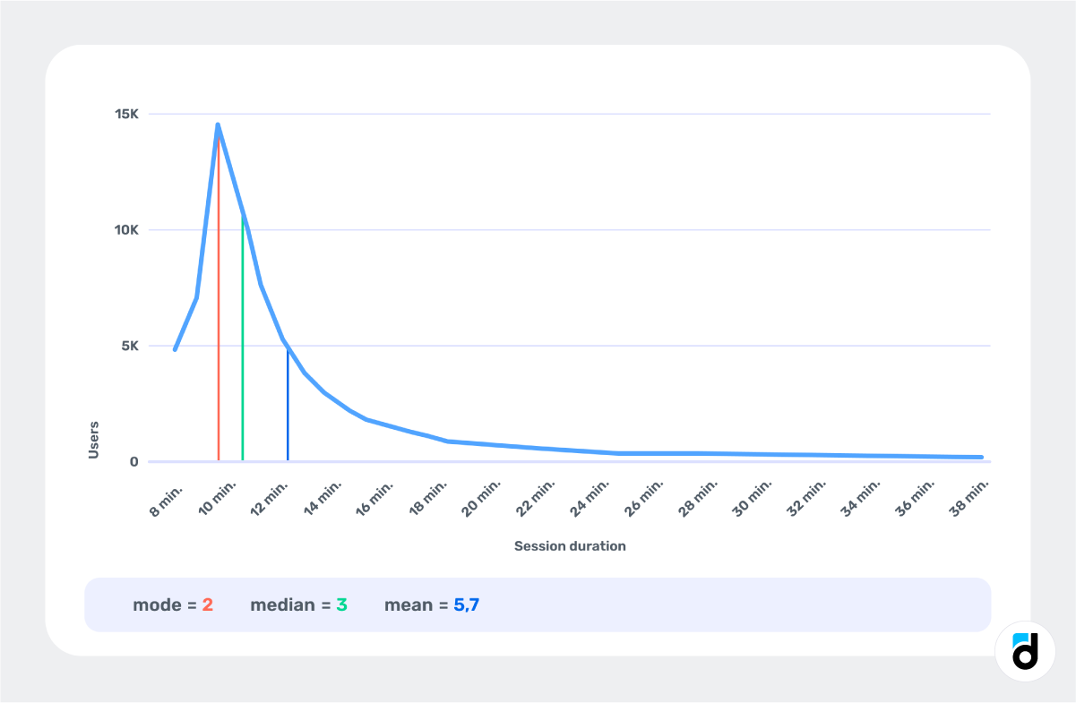 Here's what we found: the most common session duration is two minutes, true for nearly 15 thousand users. The median time is 3 minutes, and the mean is 5.7 minutes. Despite the apparent similarity in these indicators, they yield significantly different results.