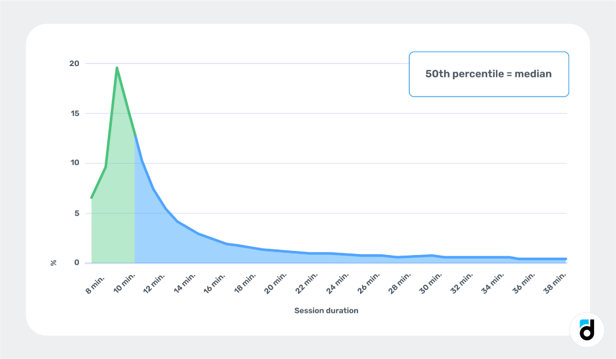 Let's apply this concept to our example. In the graph, approximately 6% of users had a session duration of around 0 minutes (rounding applied to calculations). This value corresponds to the 6th percentile, signifying that 6% of the sample has a value less than or equal to 0 minutes.