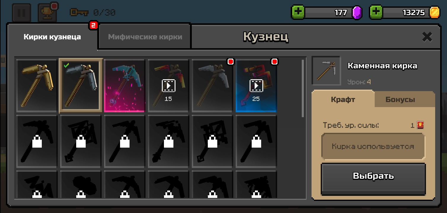 Another problem was a non-intuitive pickaxe system. The team wanted players to craft pickaxes that they visually like, and gave up as rarely as possible on one pickaxe in favor of another one just because of their characteristics. Therefore, all the picks were divided into several groups. In each group, all the pickaxes had the same coefficient by which the player’s damage was multiplied. The damage depended on the strength that could be leveled up for gold and resources.