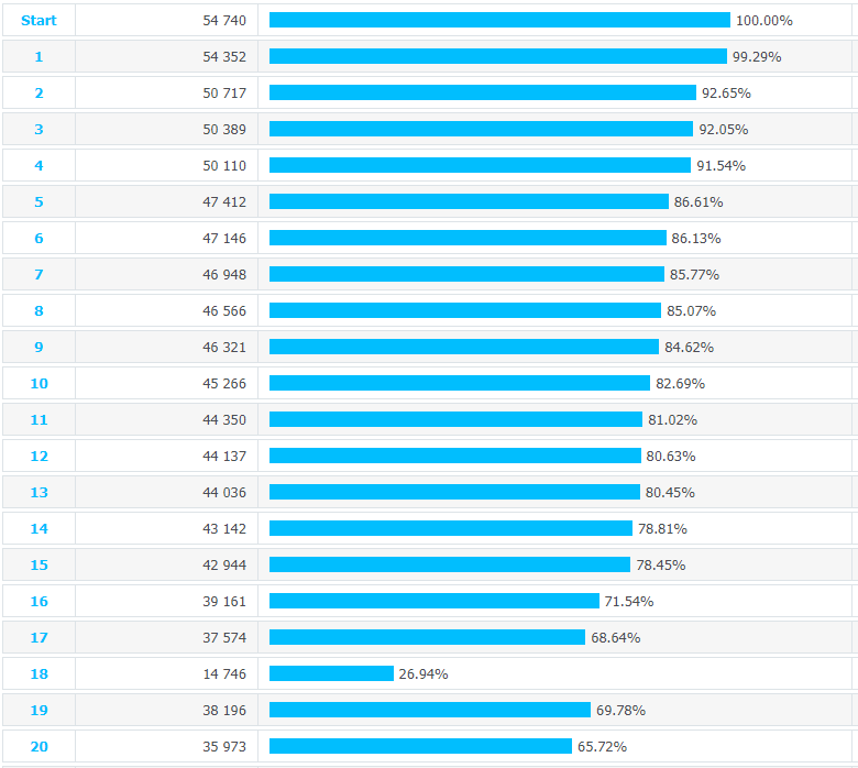 The first column is the number of the tutorial step. The second and third ones contain the number of players who have been on this step in numeric and percentage values. The fourth column is the Churn Rate or the percentage of those players who have dropped on this step.