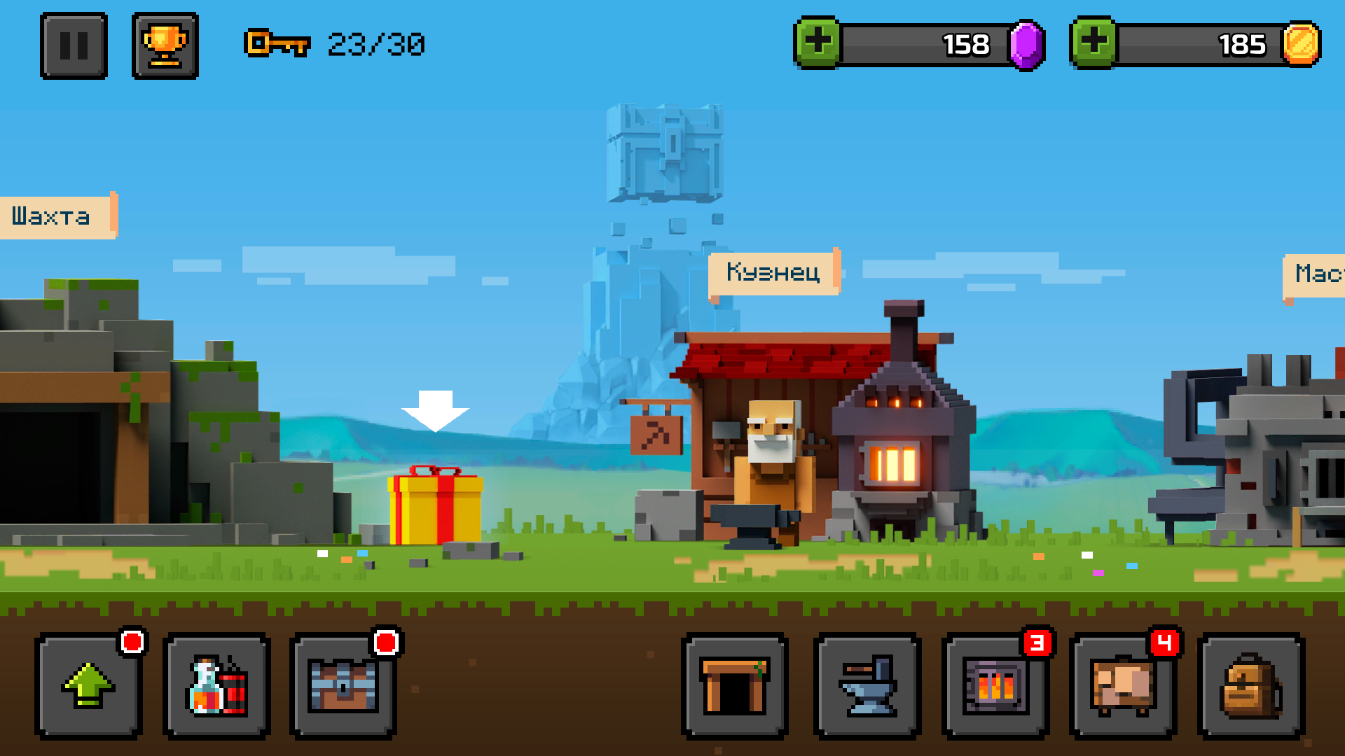 The meta game is resource management in the village. Here the player smelts the received resources into ingots, creates new picks, and cracks chests. Without cracking chests, you can’t get the keys. The latter is necessary for opening new floors with new mines.