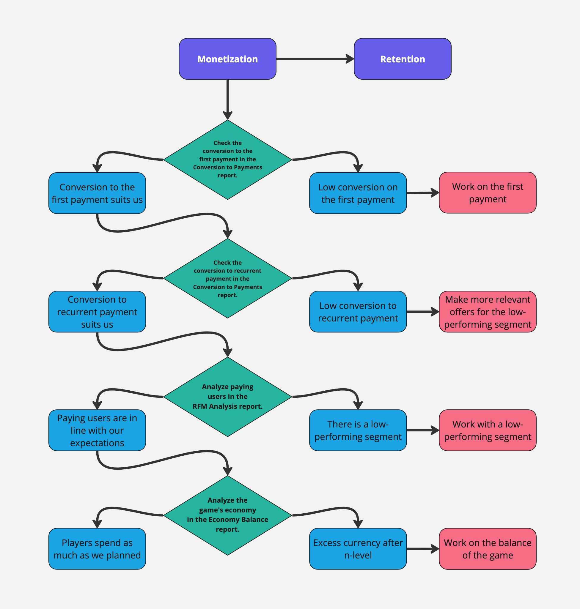 Let's take a look at the infographic. Here you can see the steps we recommend at devtodev to improve your game's monetization. Follow these steps to make the most of your game's monetization potential! In addition, the picture also illustrates how monetization is intertwined with retention, a topic we will discuss in our next article.