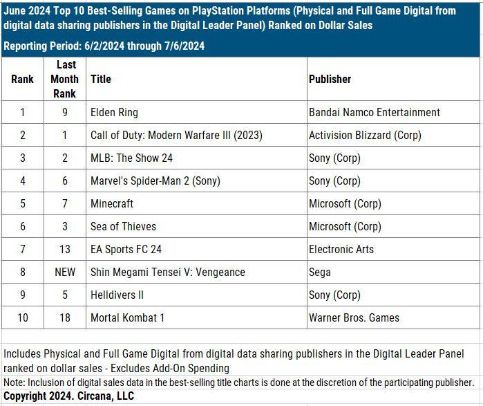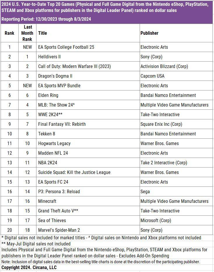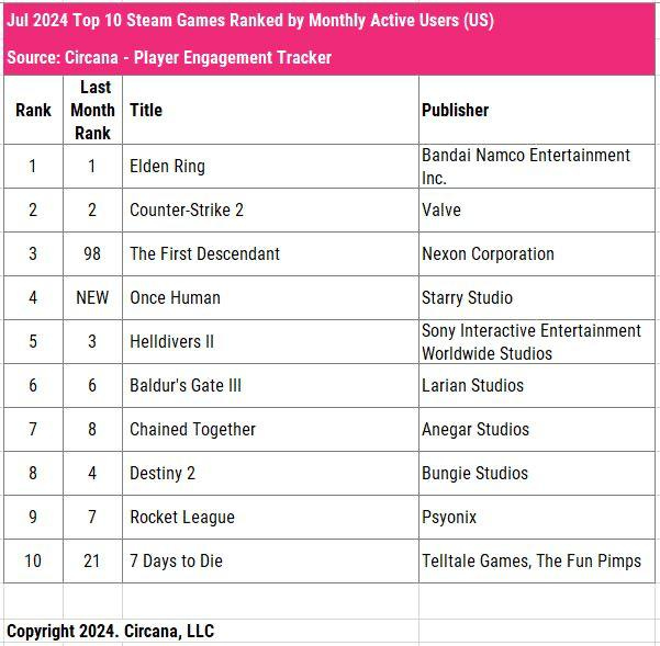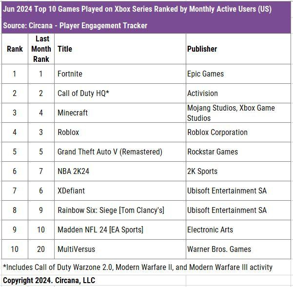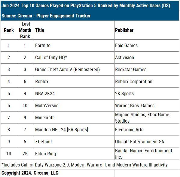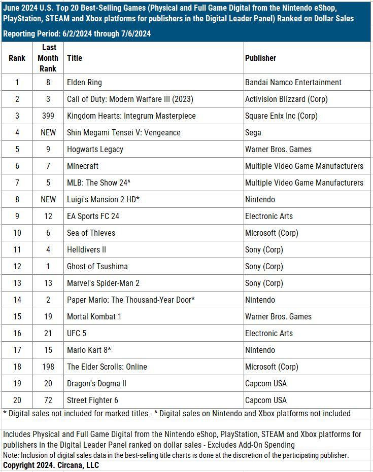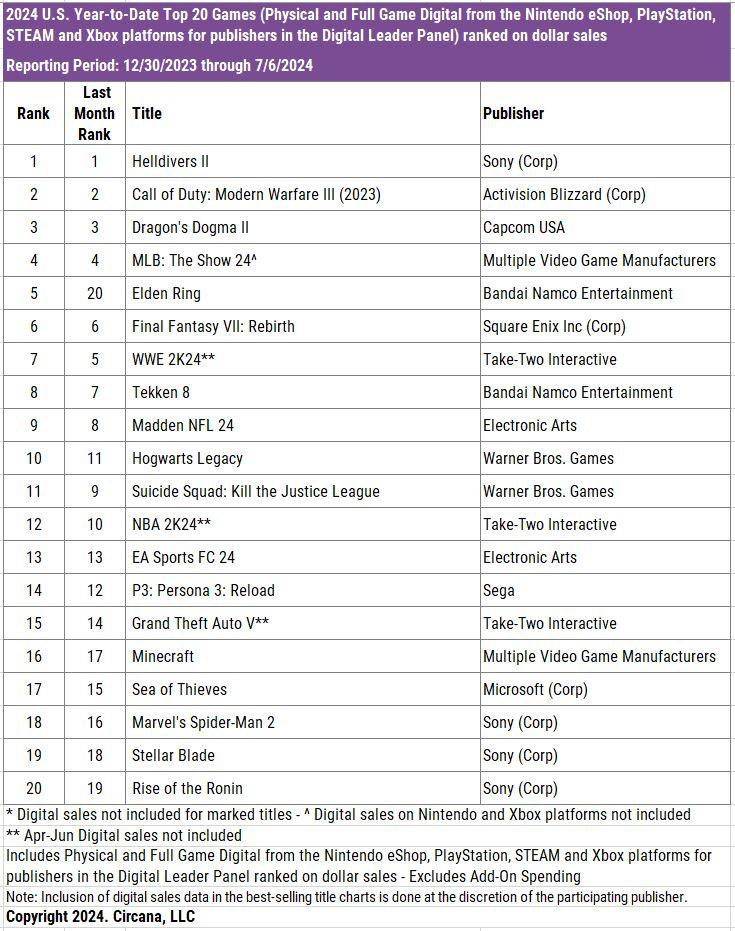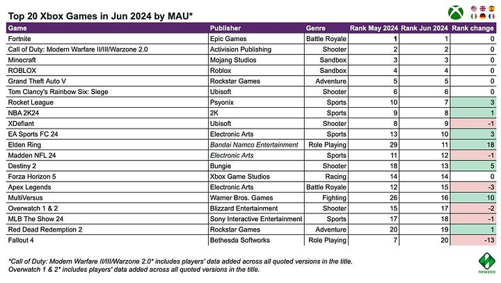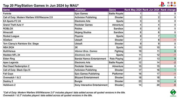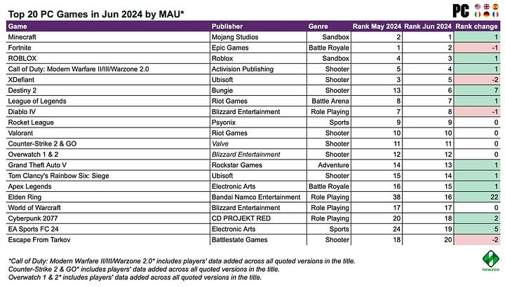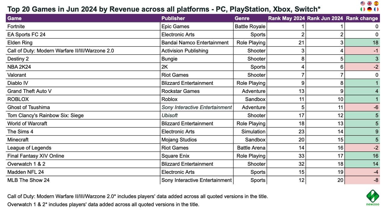 Newzoo: Top-20 PC/Console Games of June 2024 by Revenue and MAU