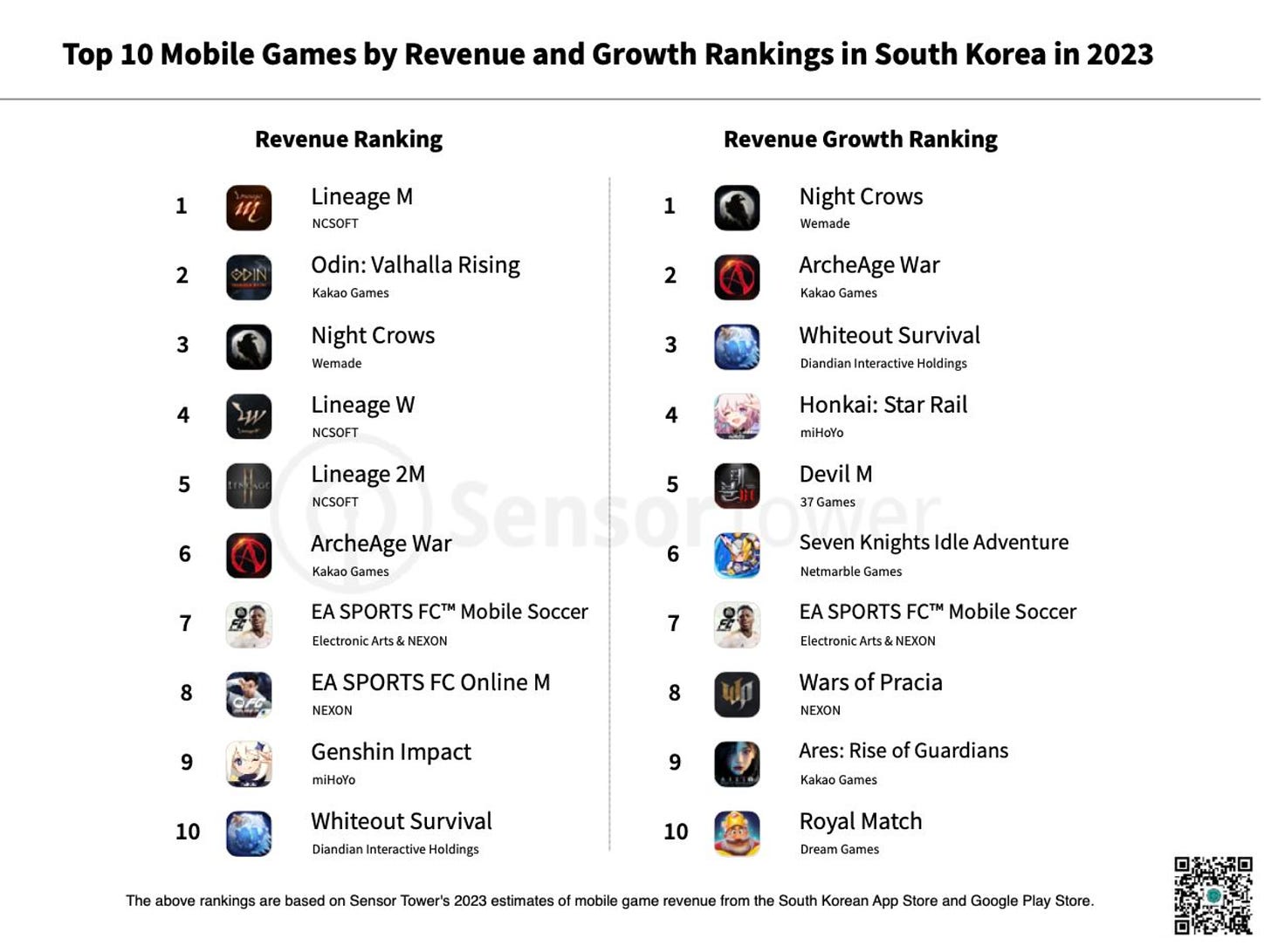 • In South Korea, the top revenue earners are Lineage M; Odin: Valhalla Rising, and Night Crows. In 2023, MMORPGs in the country earned $1.9 billion, accounting for 40% of the total market. Night Crows was the fastest-growing project by revenue, earning $180 million.