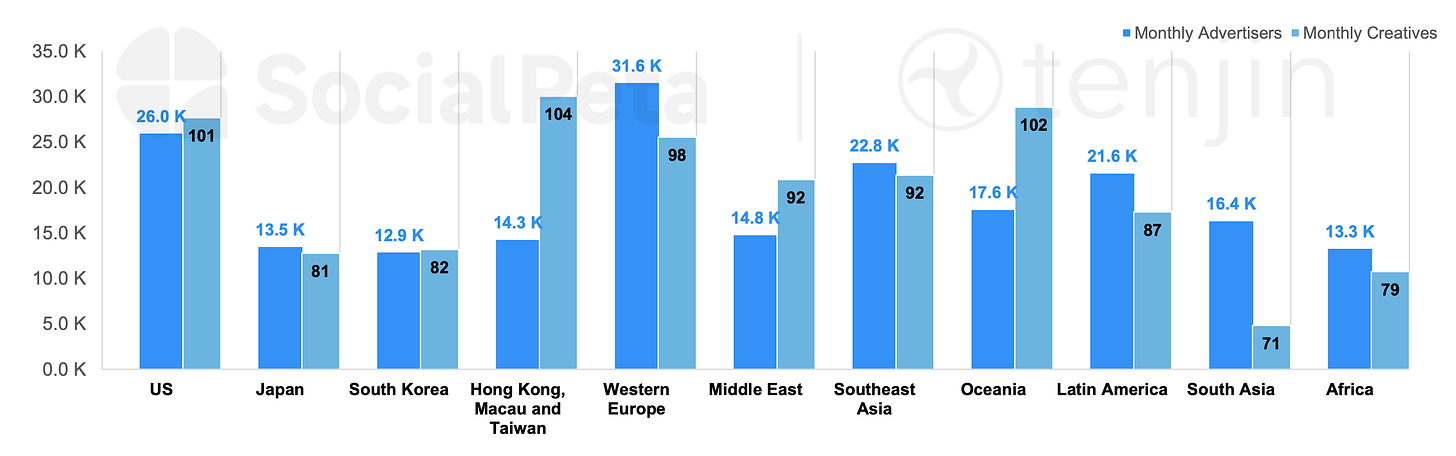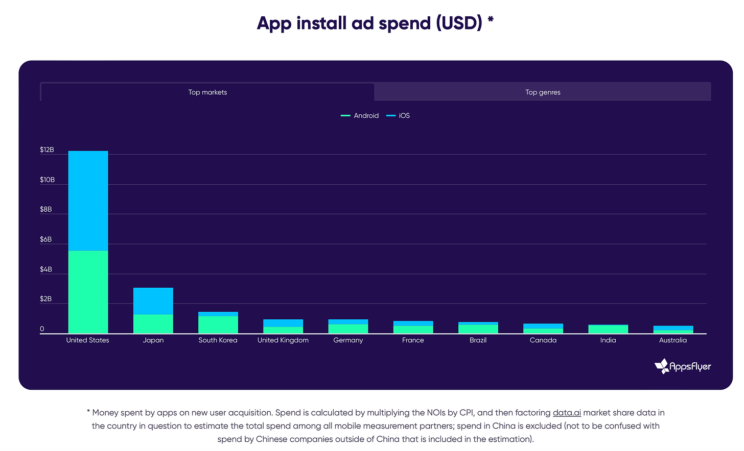 • The second-largest market in the world for marketing spending is Japan ($1.8 billion on iOS and $1.2 billion on Android). South Korea ranks third. The largest European markets are the U.K., Germany, and France.