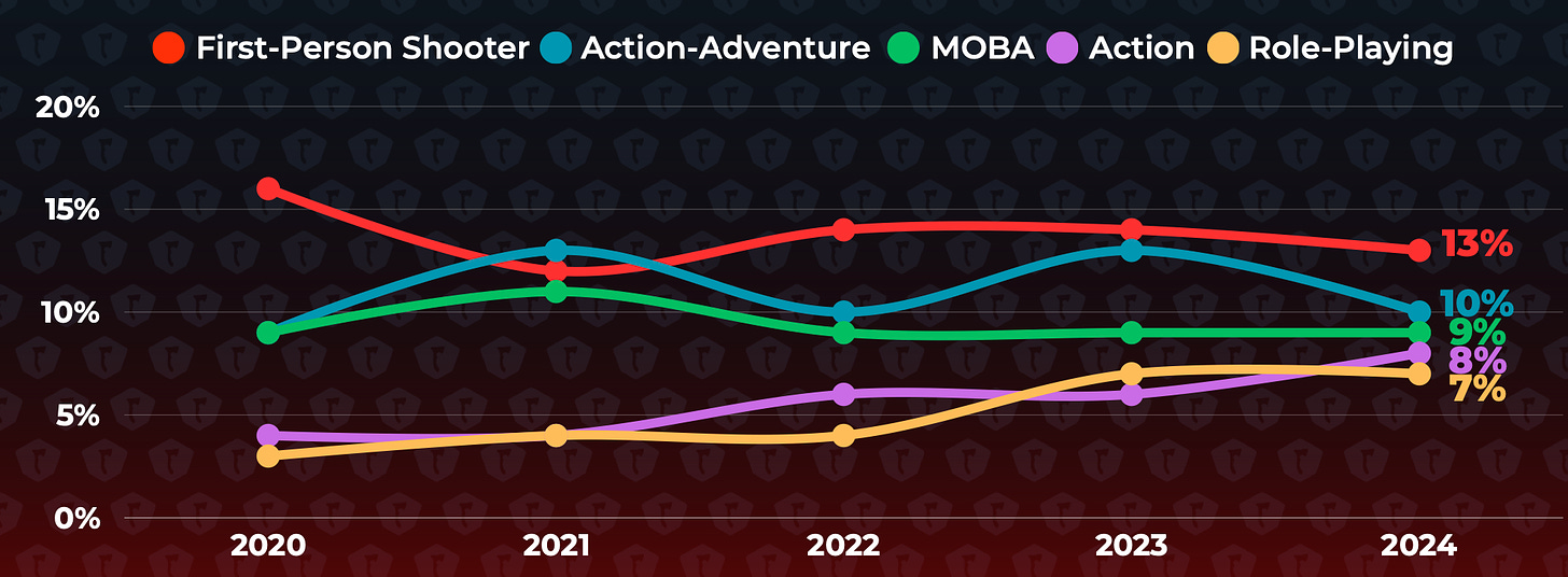 • FPS (1.2 billion hours, -4% YoY), Action-Adventure (831 million hours, -24% YoY), and MOBA (812 million hours, +3% YoY) were the most popular genres on streaming platforms. The decline in Action-Adventure is due to the lack of major new games, unlike last year when Diablo IV and The Legend of Zelda: Tears of the Kingdom were released.