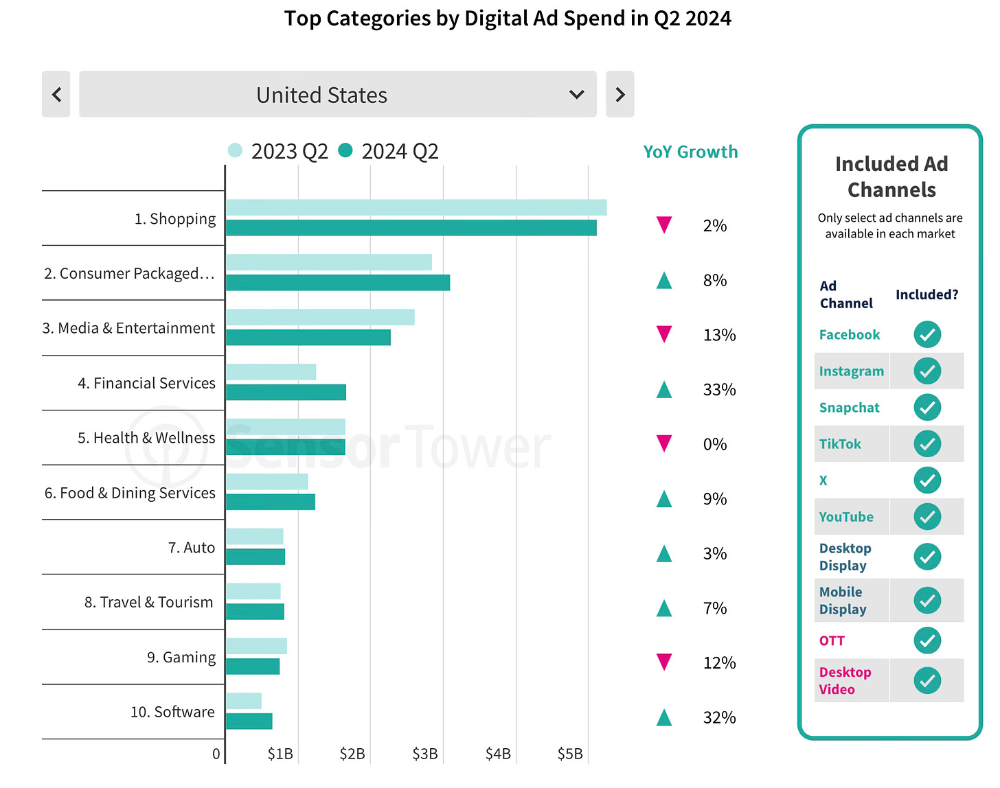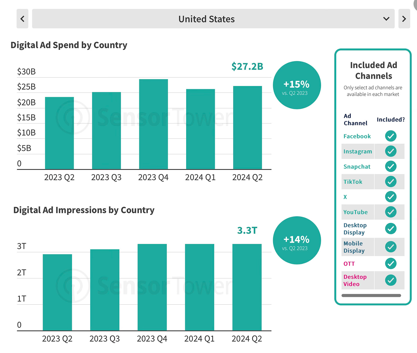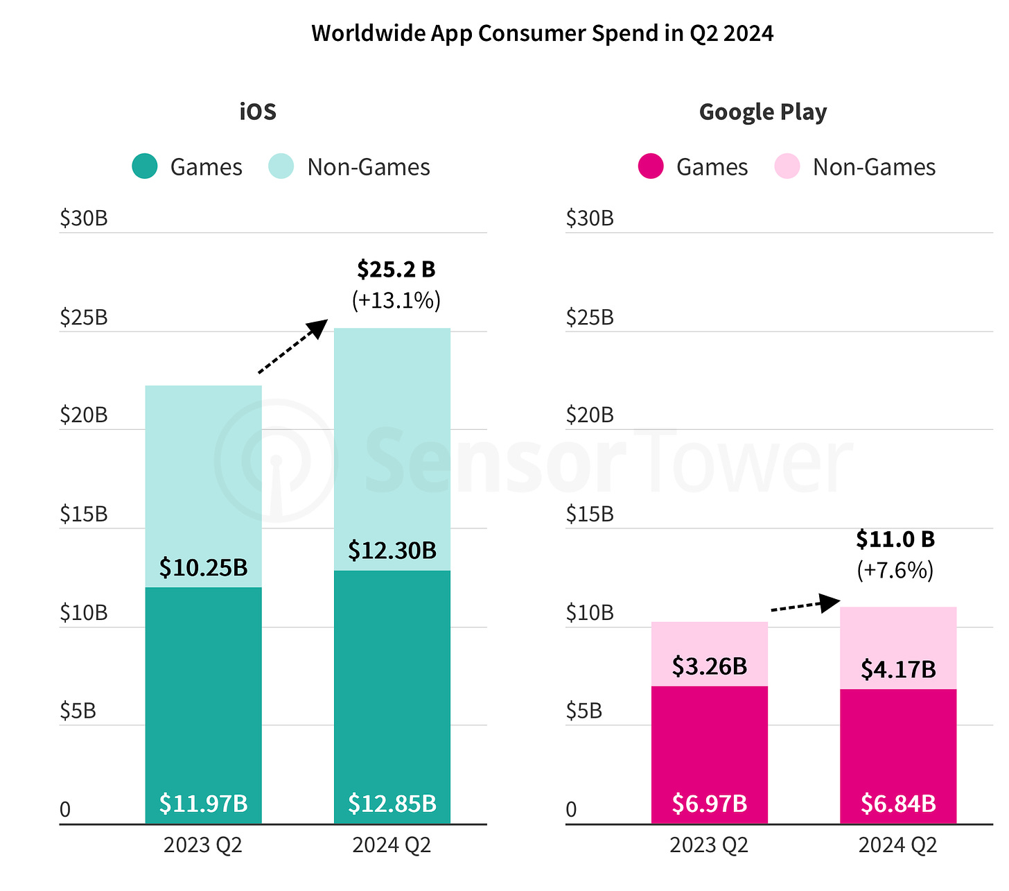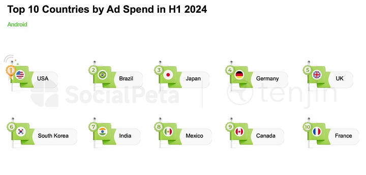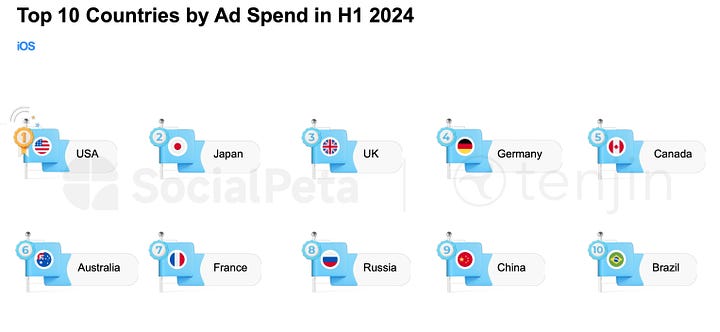 • The U.S. accounted for $6.6 billion in iOS spending and $5.5 billion in Android spending in 2023. This is more than the next 10 markets combined.