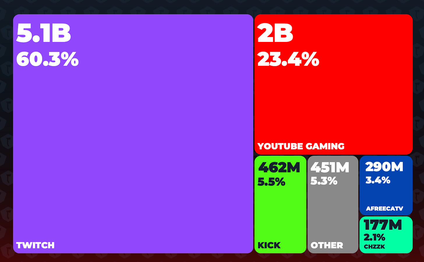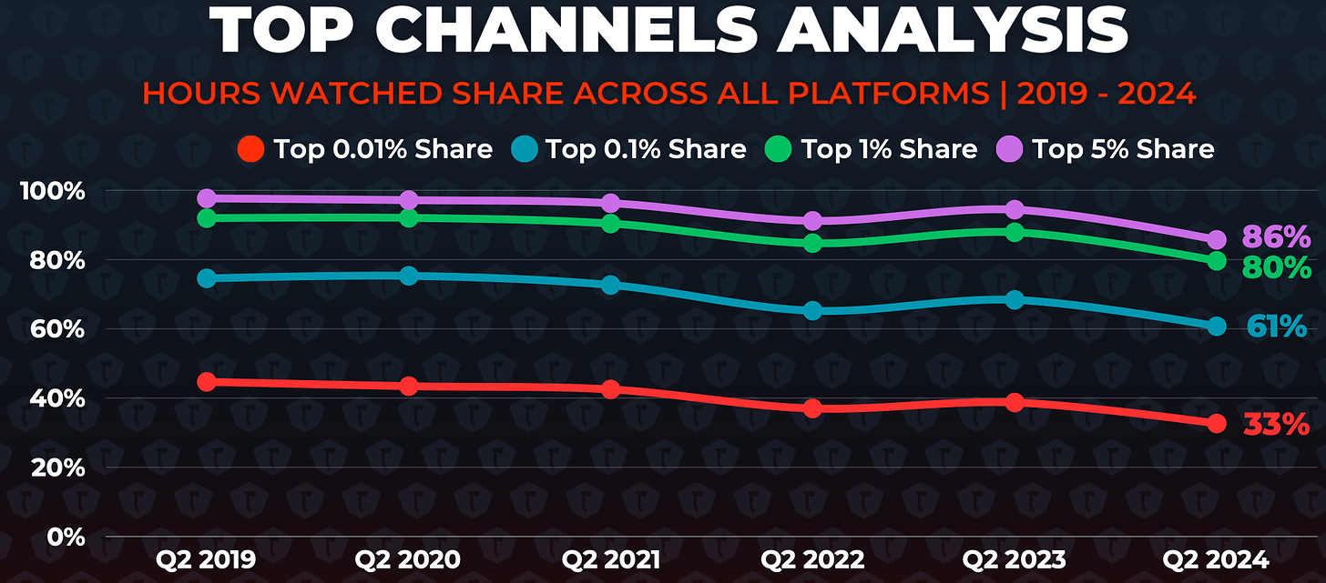 • In Q2 2024, the top 5% of channels accounted for 86% of all hours watched. The top 0.01% of channels accounted for 33% of all hours watched.
