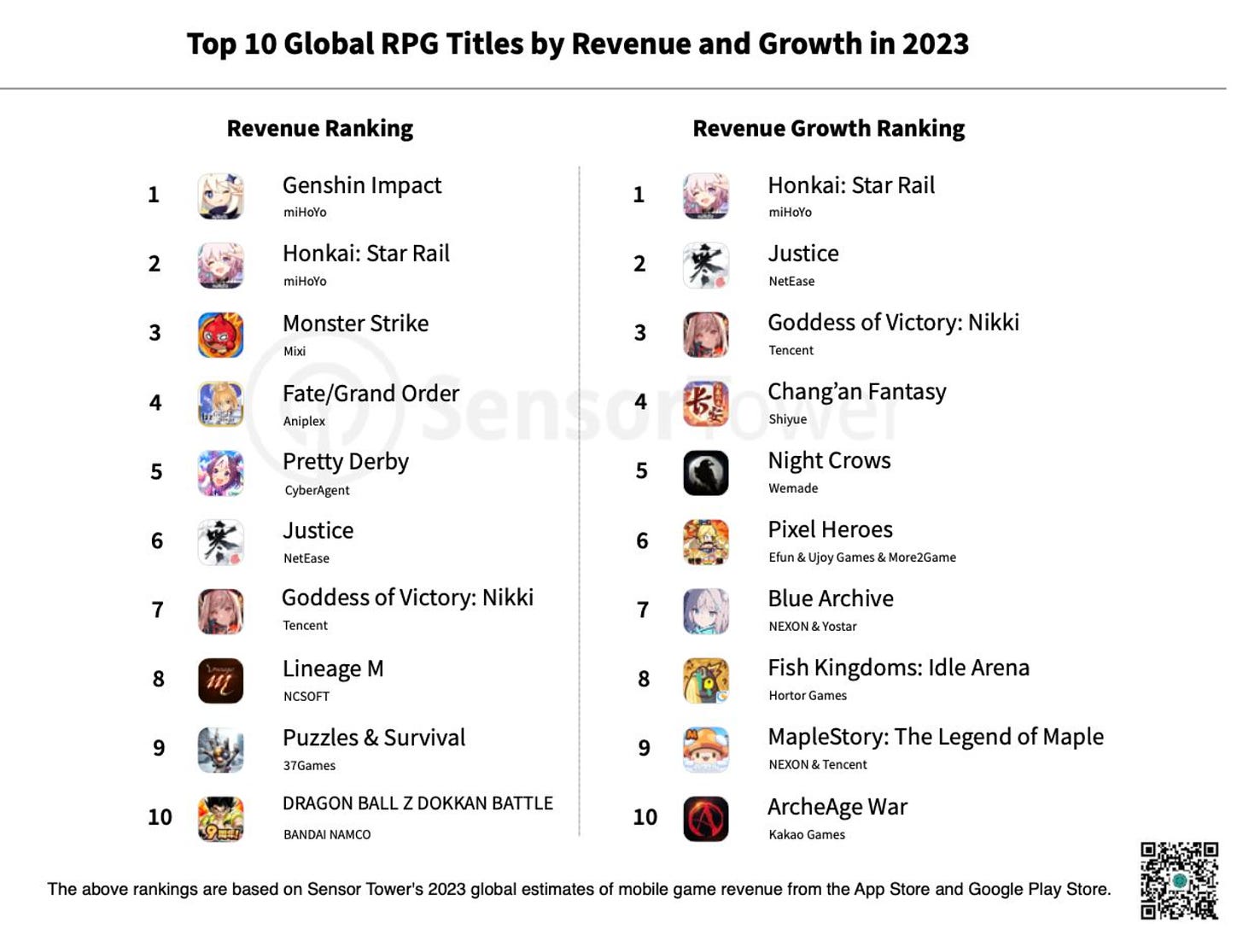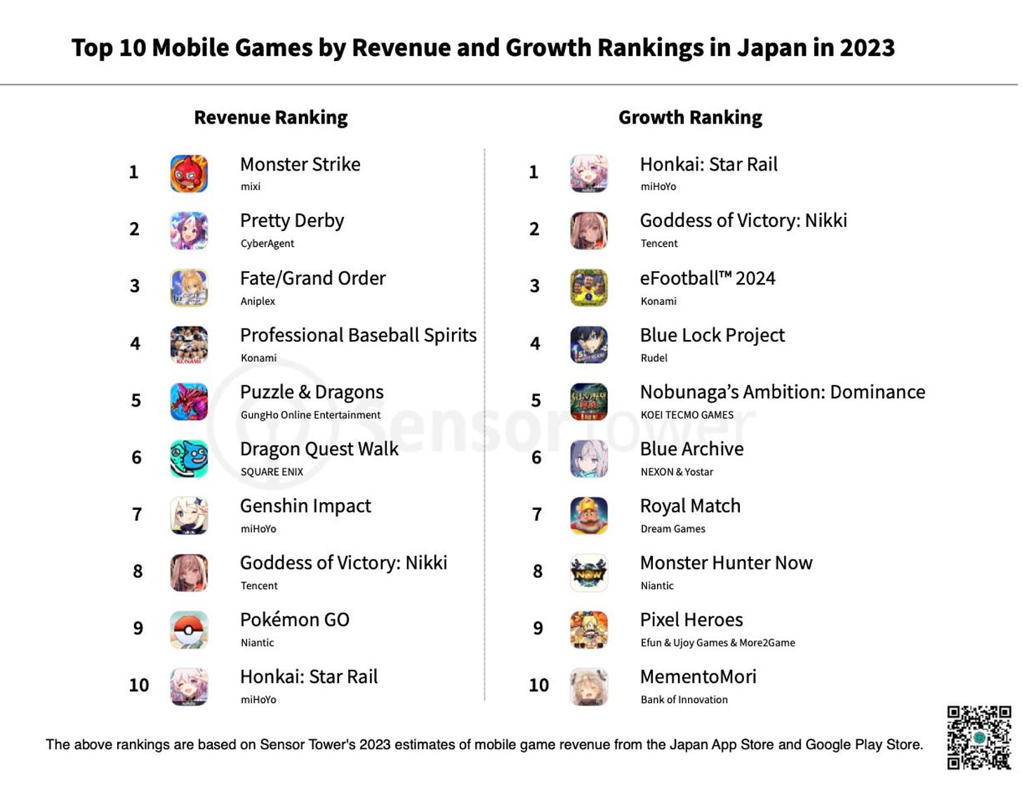• Monster Strike, Pretty Derby, and Fate/Grand Order are the top-earning games in the Japanese market. However, Honkai: Star Rail is the fastest-growing game in the country by revenue. Japan accounts for 21% of the game's total revenue, making it the largest overseas market for the game. Goddess of Victory: Nikke is in second place, with a revenue growth of 182% in 2023.