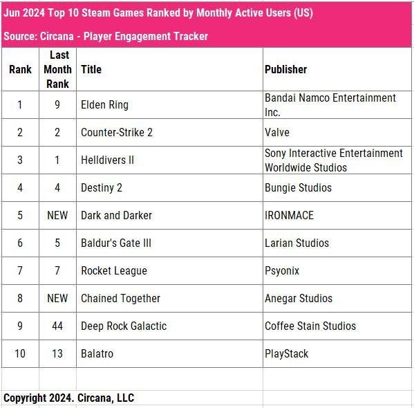 • According to the service, the leaders in revenue for the first half of 2024 are Counter-Strike 2 ($610 million), Helldivers II ($458 million), and Palworld ($378 million).