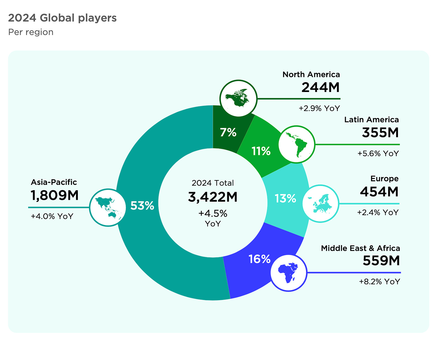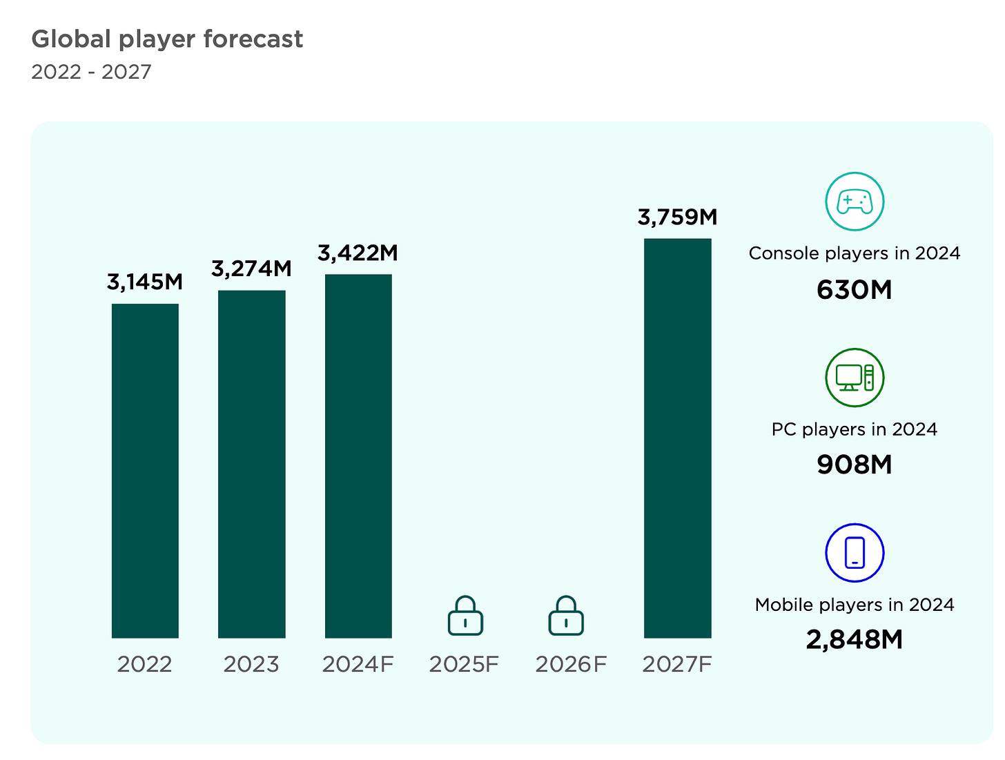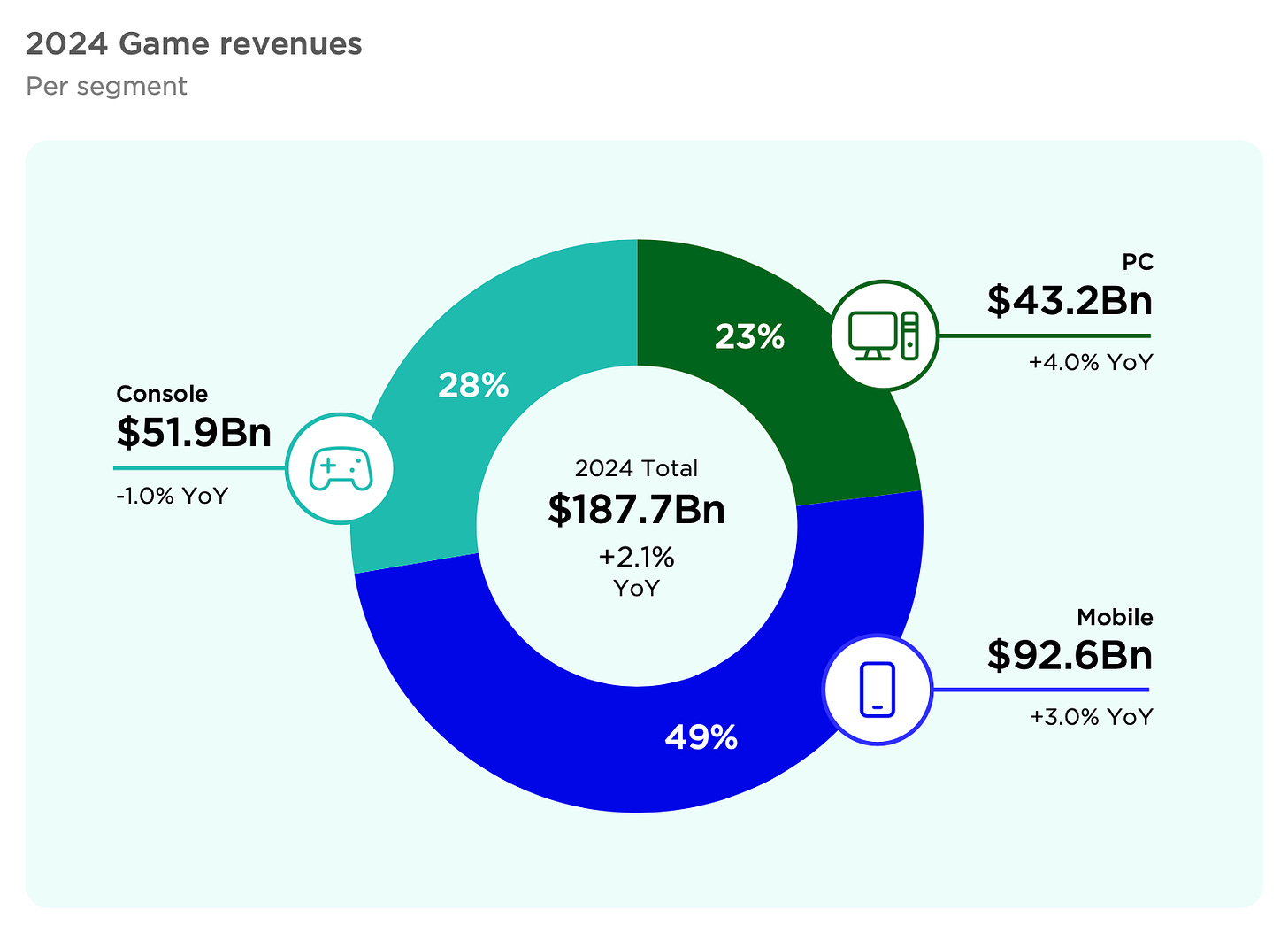 • Mobile remains the largest segment, accounting for 68.4% of the region's total revenue. However, over the years, this share will decrease. Consoles and PC will show growth.