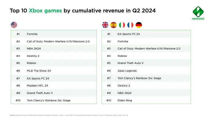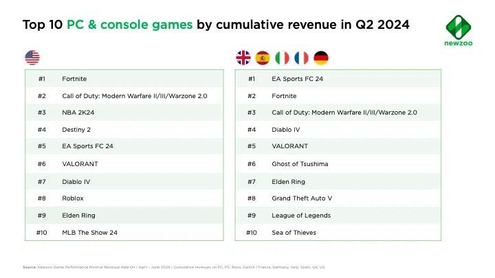 • Fortnite, EA Sports FC 24, and Call of Duty (MW2/MW3/Warzone) were the leaders in revenue for the second quarter across the six tracked markets. Elden Ring finished the quarter in 8th place, and Ghost of Tsushima in 10th. Together, these two projects accounted for 4.2% of all gaming revenue for the quarter.