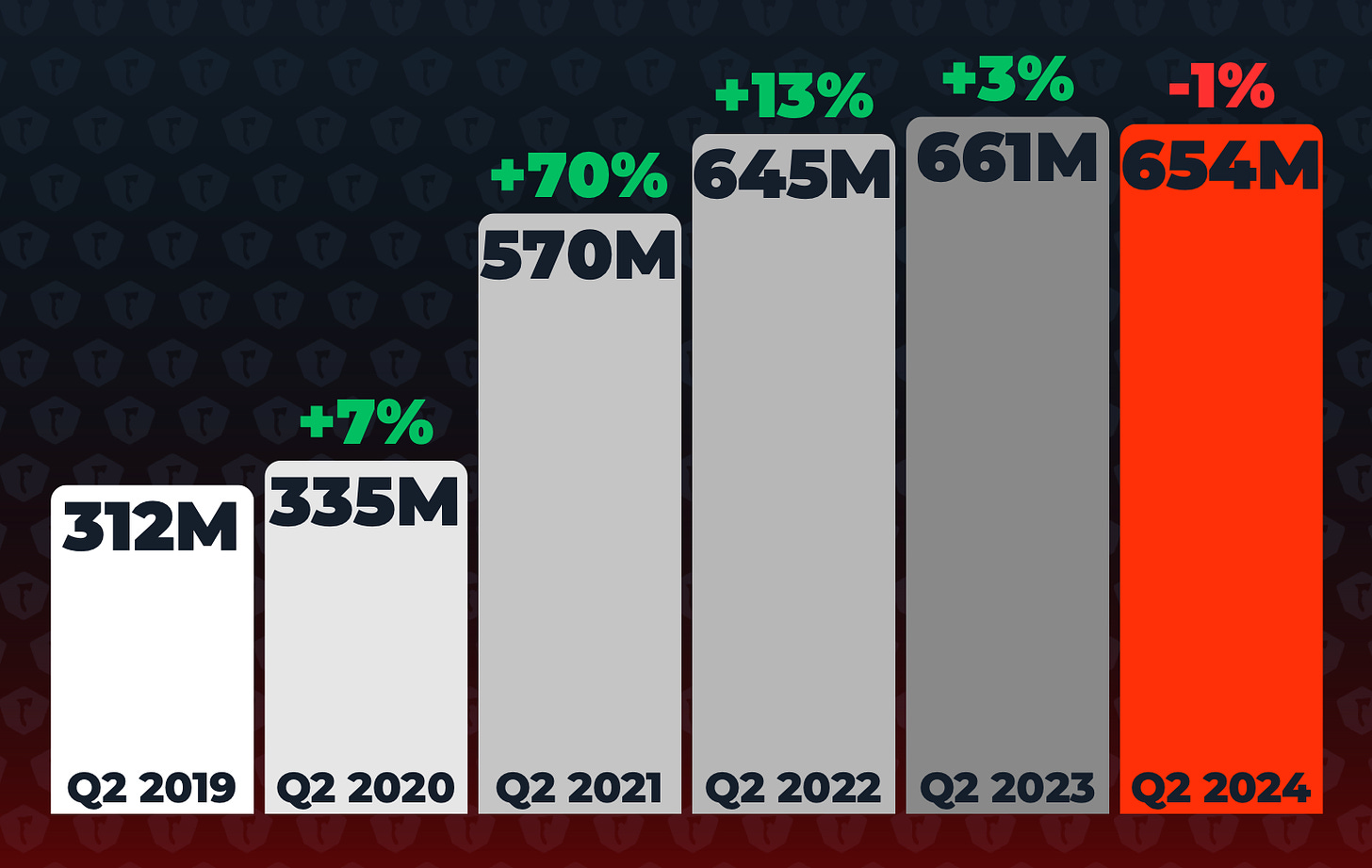 • The revenue for the first half of 2024 was $27.320 billion, 1% more than the same period in 2023. From April to June 2024, the market has been below 2023 results.