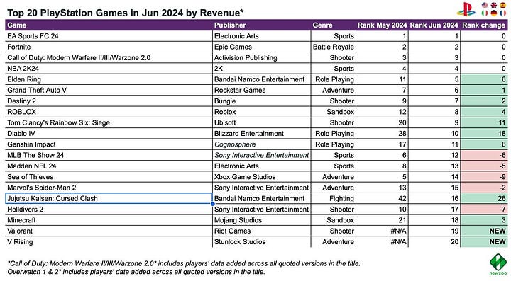 • On PlayStation, the fighting game Jujutsu Kaisen: Cursed Clash jumped into the top 20 by revenue in June. Valorant and V Rising entered for the first time. Helldivers II dropped to 17th position (previously 10th last month).