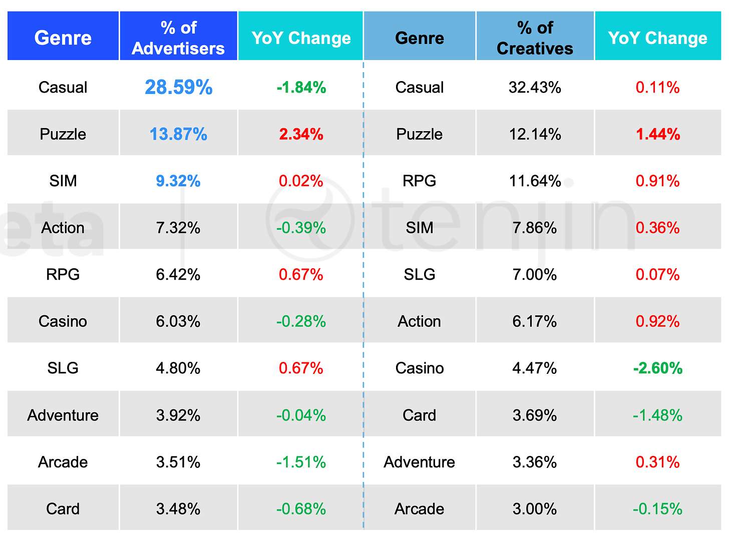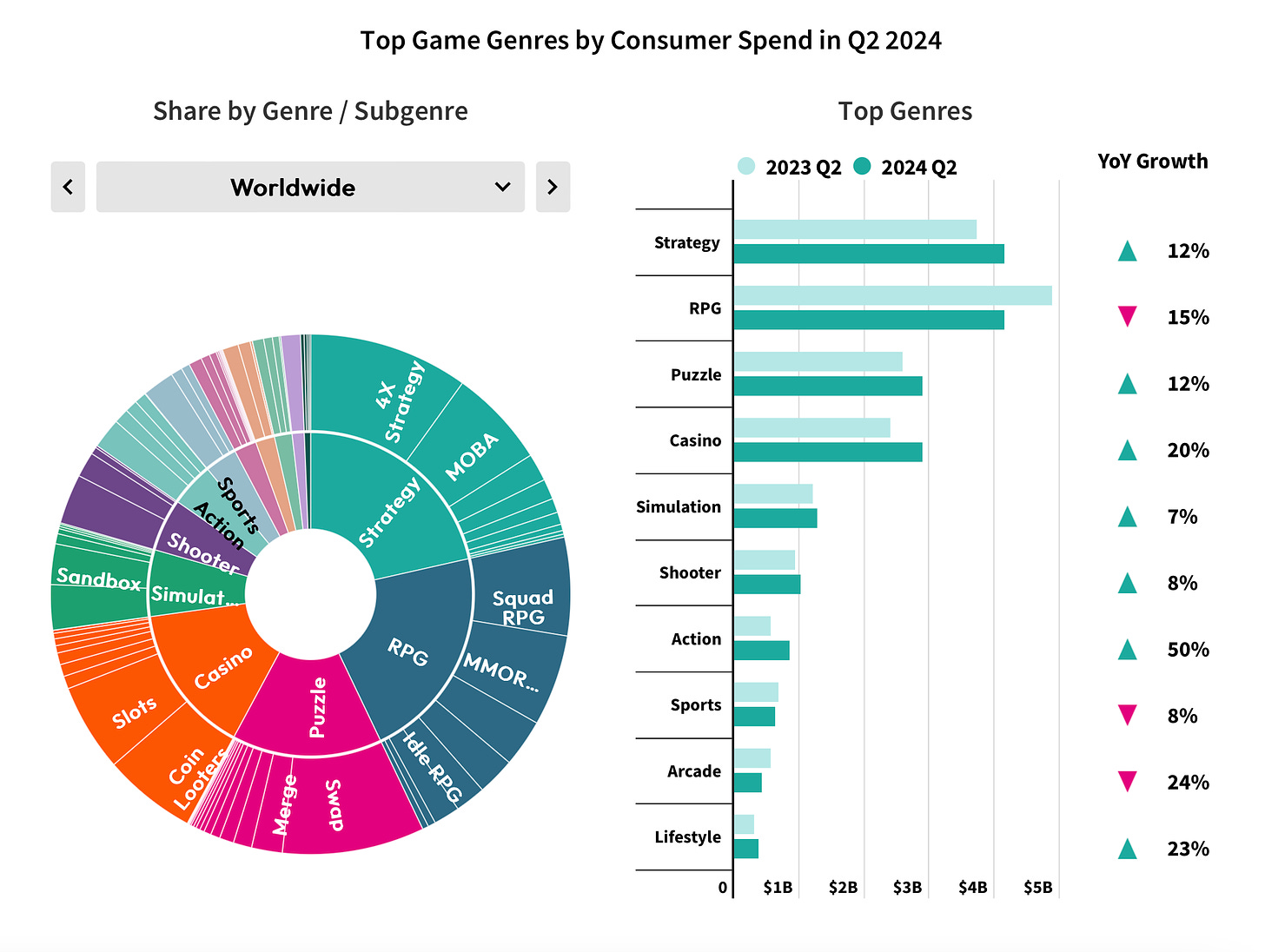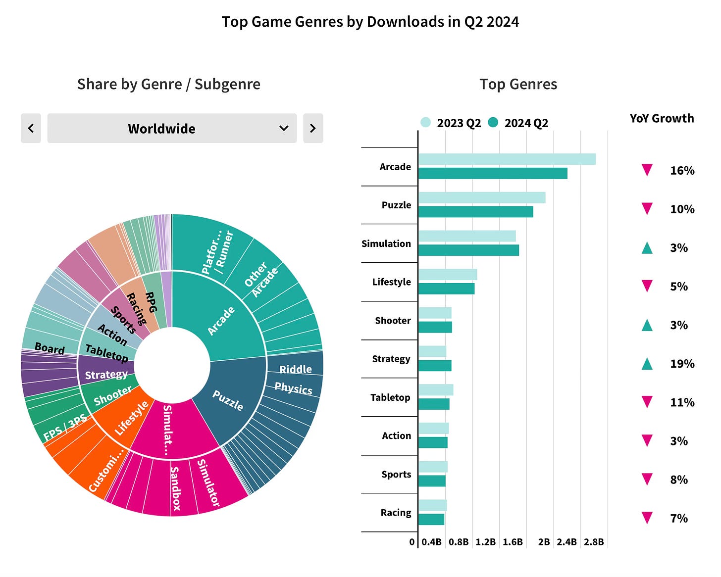 • The strongest growth was seen in card/board games, which grew by 18% (thanks to the success of MONOPOLY GO!); puzzle games showed significant growth (+10% YoY), largely due to the success of Royal Match.