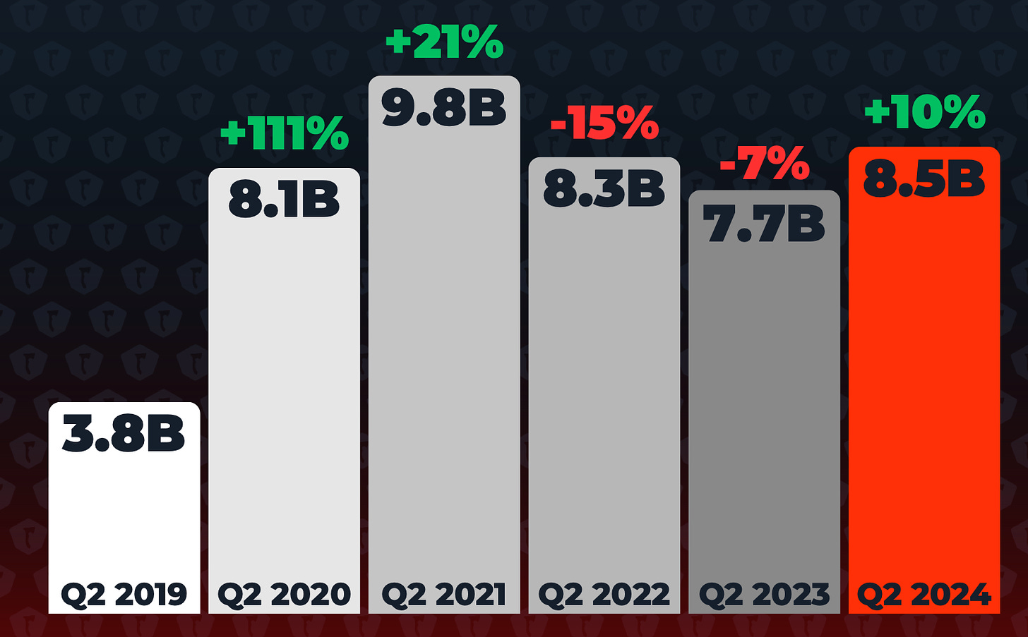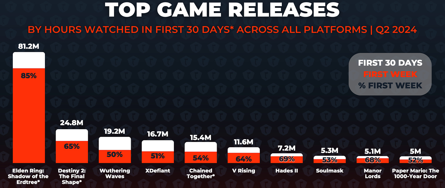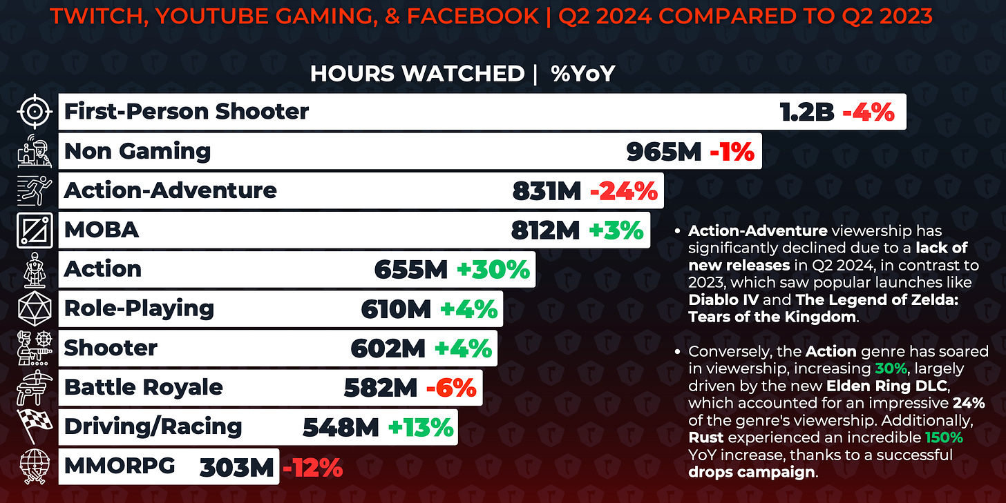 • Elden Ring saw the largest growth in Q2 2024, with views up by 331% (reaching 161 million hours), driven by the release of a DLC.