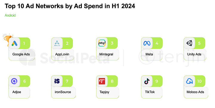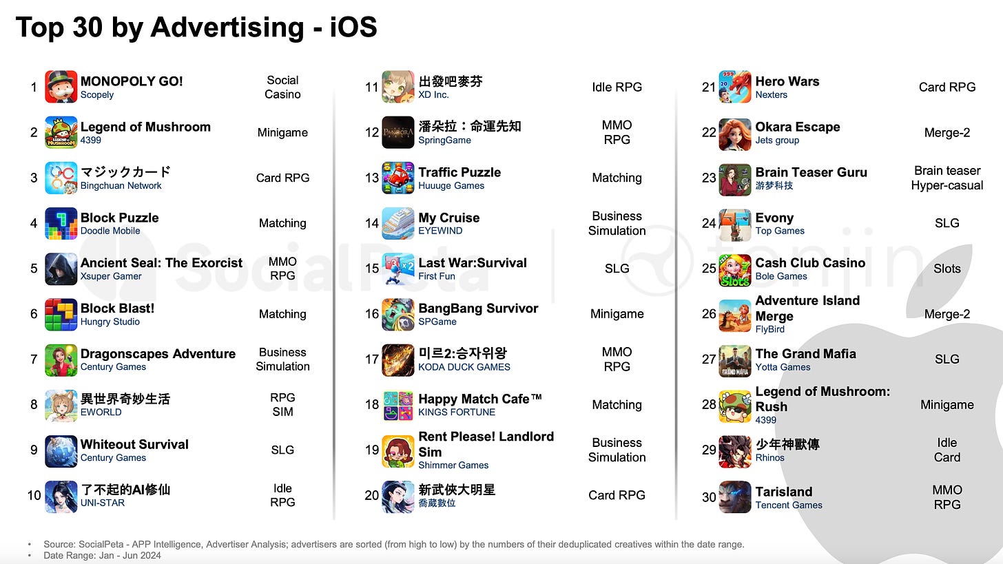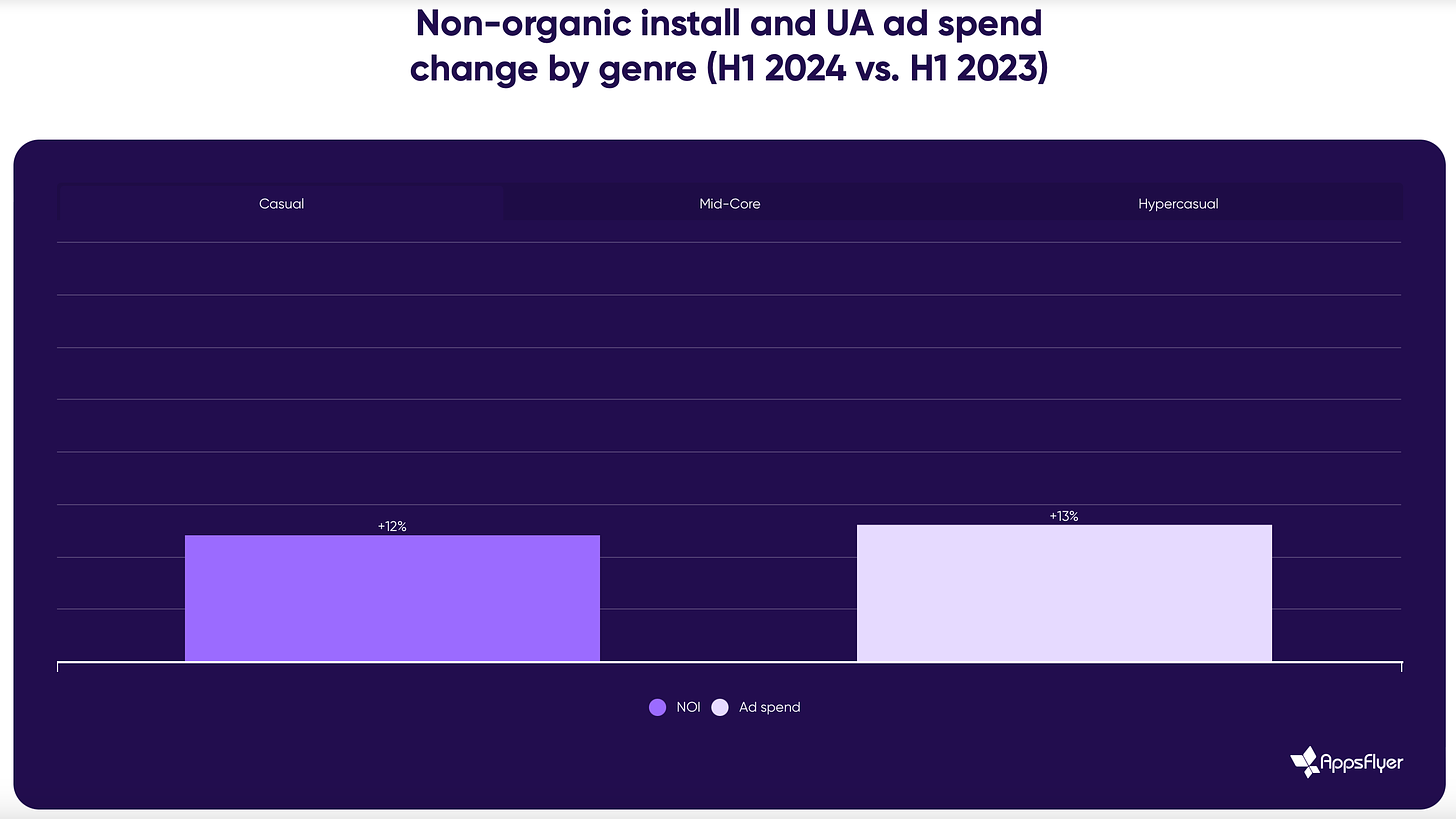 2. Acquisition in casual games is growing; in mid-core and hyper-casual games, it is declining. In H1 2024, non-organic installs in mid-core games decreased by 5% on Android and by 15% on iOS. In hyper-casual games, ad spending decreased by 6%. Meanwhile, casual games are trending upward—Match games (+13% on Android); action games (+18% on iOS); simulation games (+25% on Android); board games (+29% on iOS). Puzzle and sports games are also showing growth on iOS.