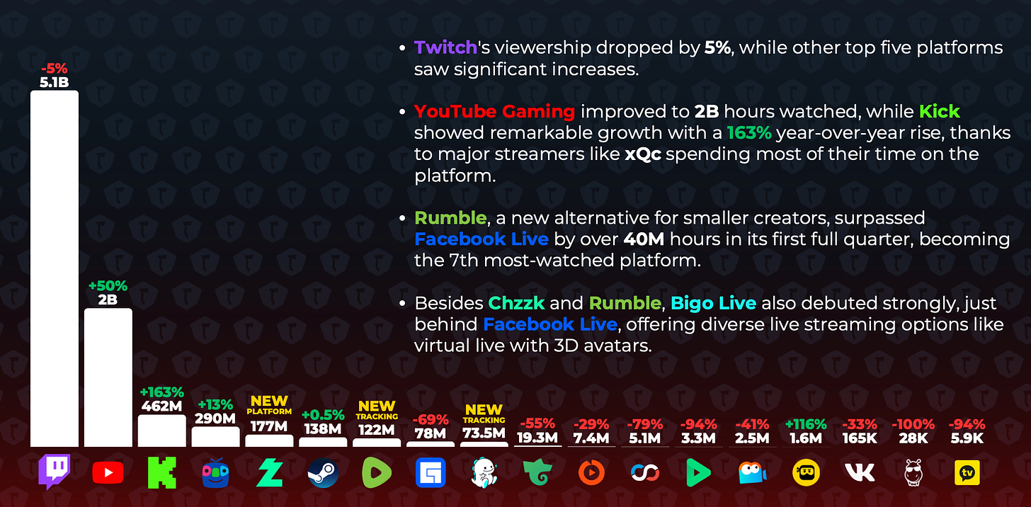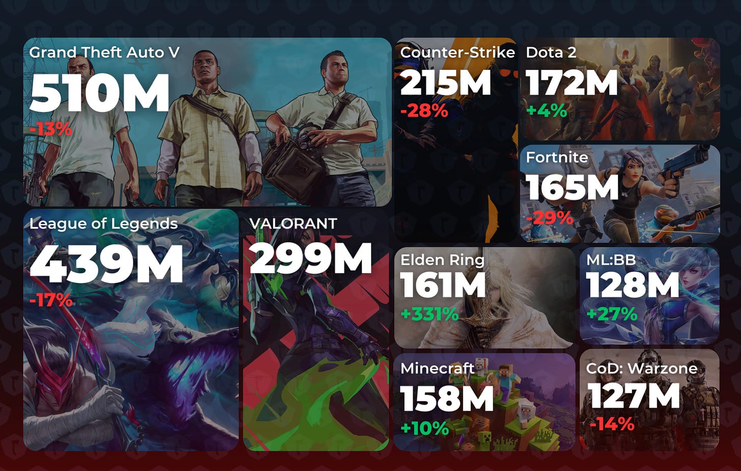 • Grand Theft Auto V (510 million hours, -13% YoY), League of Legends (439 million hours, -17% YoY), and Valorant (299 million hours) were the leaders in viewership.