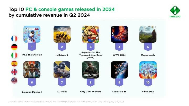 • Among games released in 2024, the leaders in cumulative revenue in Q2’24 were MLB: The Show 24, Helldivers II, and Paper Mario: The Thousand-Year Door. Also on the list are XDefiant (7th place) and MultiVersus.