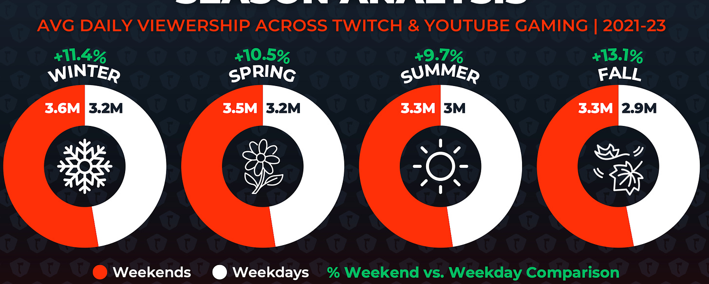 • The biggest difference between weekday and weekend viewing hours occurs in the fall, with 13.1% more hours watched on weekends. The smallest difference is in the summer at 9.7%, likely due to many people going on vacation.