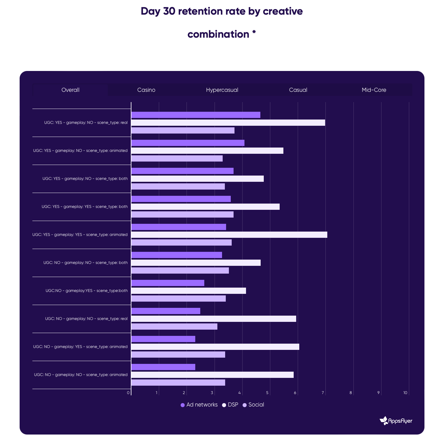 • AppsFlyer analyzed D30 Retention for different types of creatives across various ad channels. It was found that for hyper-casual games, the best combination is UGC with real or animated scenes. For mid-core projects, both UGC and gameplay videos—whether with real or animated scenes—work well.