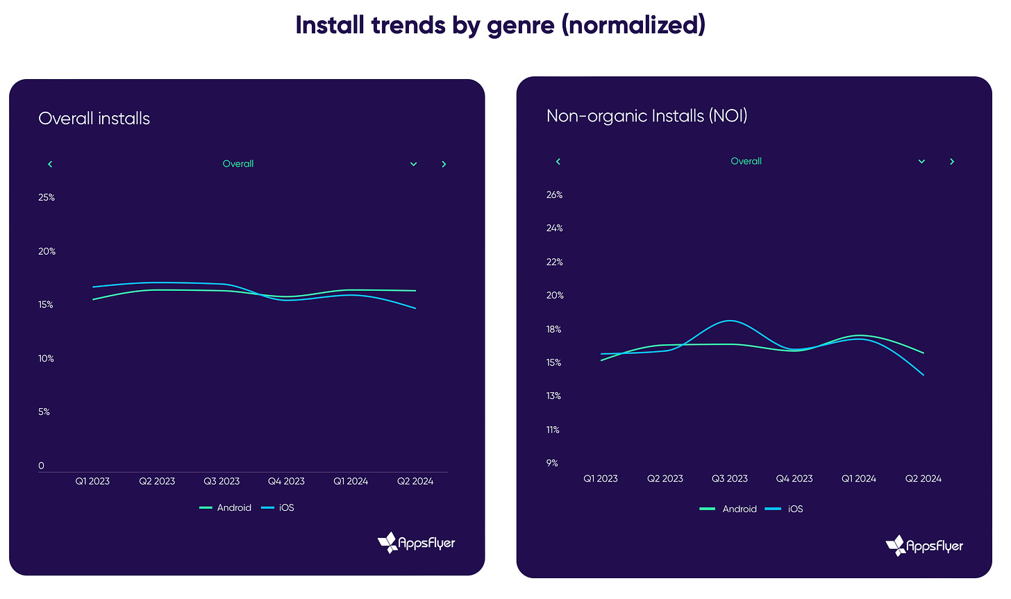6. Installs on Android increased by 3% (both overall and non-organic installs) in the first half of 2024. On iOS, however, there was a 9% overall decline and a 2% drop in non-organic installs. The biggest declines in installs on iOS were in RPGs (-36% overall; -25% in paid traffic) and strategy games (-15% overall; -48% in paid traffic).