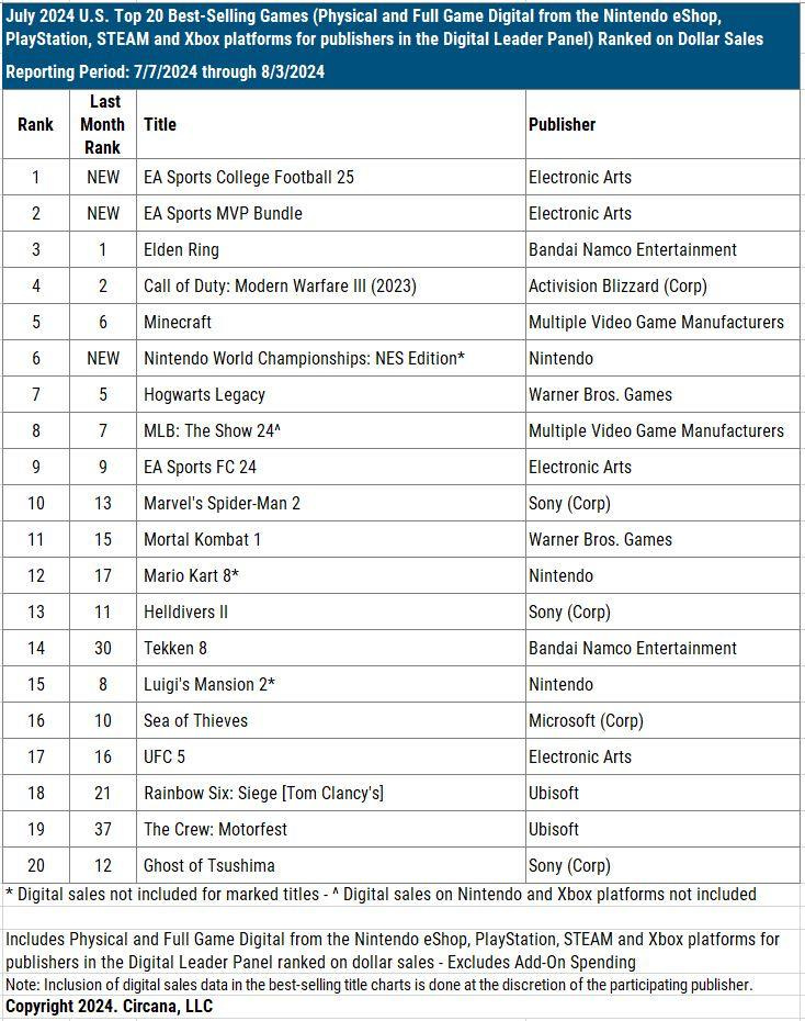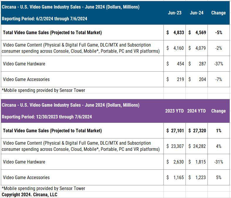 • Revenue from game sales in June was $4.079 billion, 2% less year-over-year. Hardware sales plummeted by 37% to $287 million. Sales of gaming accessories decreased by 7% to $204 million.