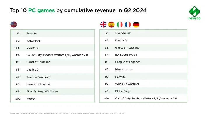 • PC - Valorant leads in revenue in Europe (7.2% of all revenue in Q2’24); Fortnite leads in the USA. Ghost of Tsushima accounted for 6% of all PC sales in Europe and 4% in the USA by the end of the second quarter.