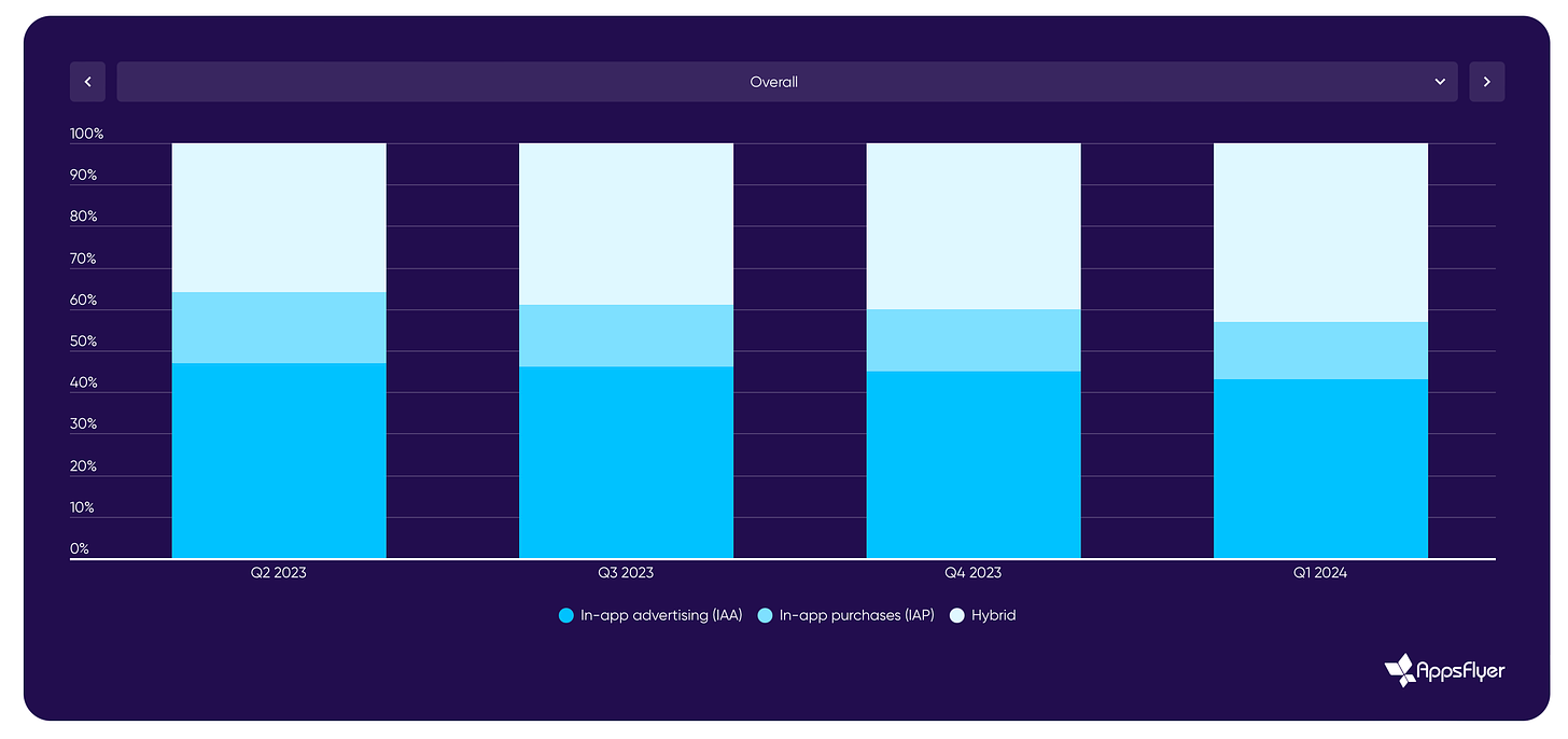 1. Games in genres with IAP monetization are integrating ads; games in genres with IAA are integrating IAP monetization. For example, RPGs have seen an increase in ad revenue but a decrease in IAP revenue. The overall trend is as follows: the share of games with hybrid monetization grew from 36% in Q2 2023 to 43% in Q1 2024; the share of games with ad-only monetization decreased from 47% in Q2 2023 to 43% in Q1 2024; the share of games with IAP-only monetization decreased from 17% in Q2 2023 to 14% in Q1 2024.