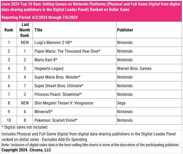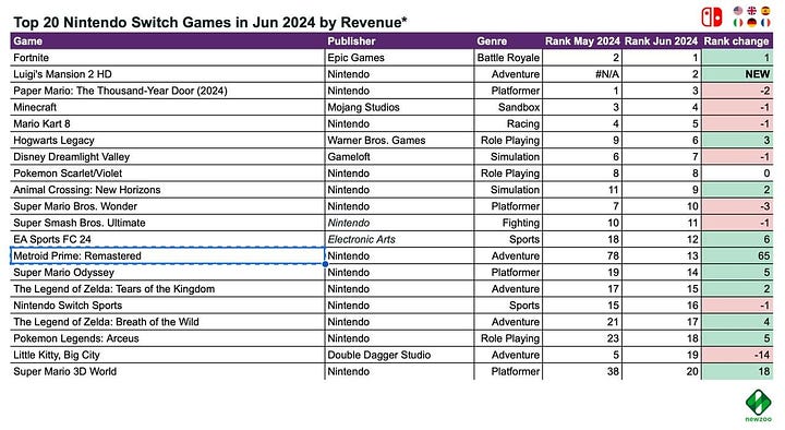 • On Nintendo Switch, everything is relatively stable. Fortnite rose to the first position; Luigi's Mansion 2 HD took second place. Metroid Prime: Remastered had an excellent month, jumping to 13th place on the chart.