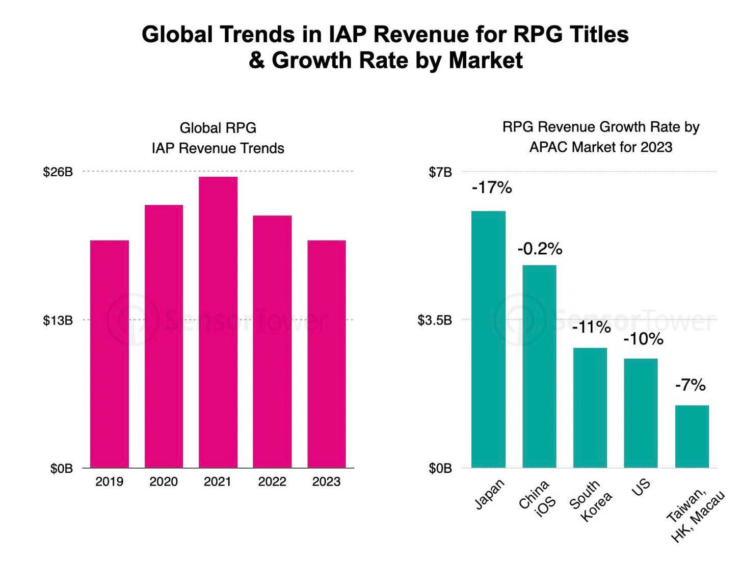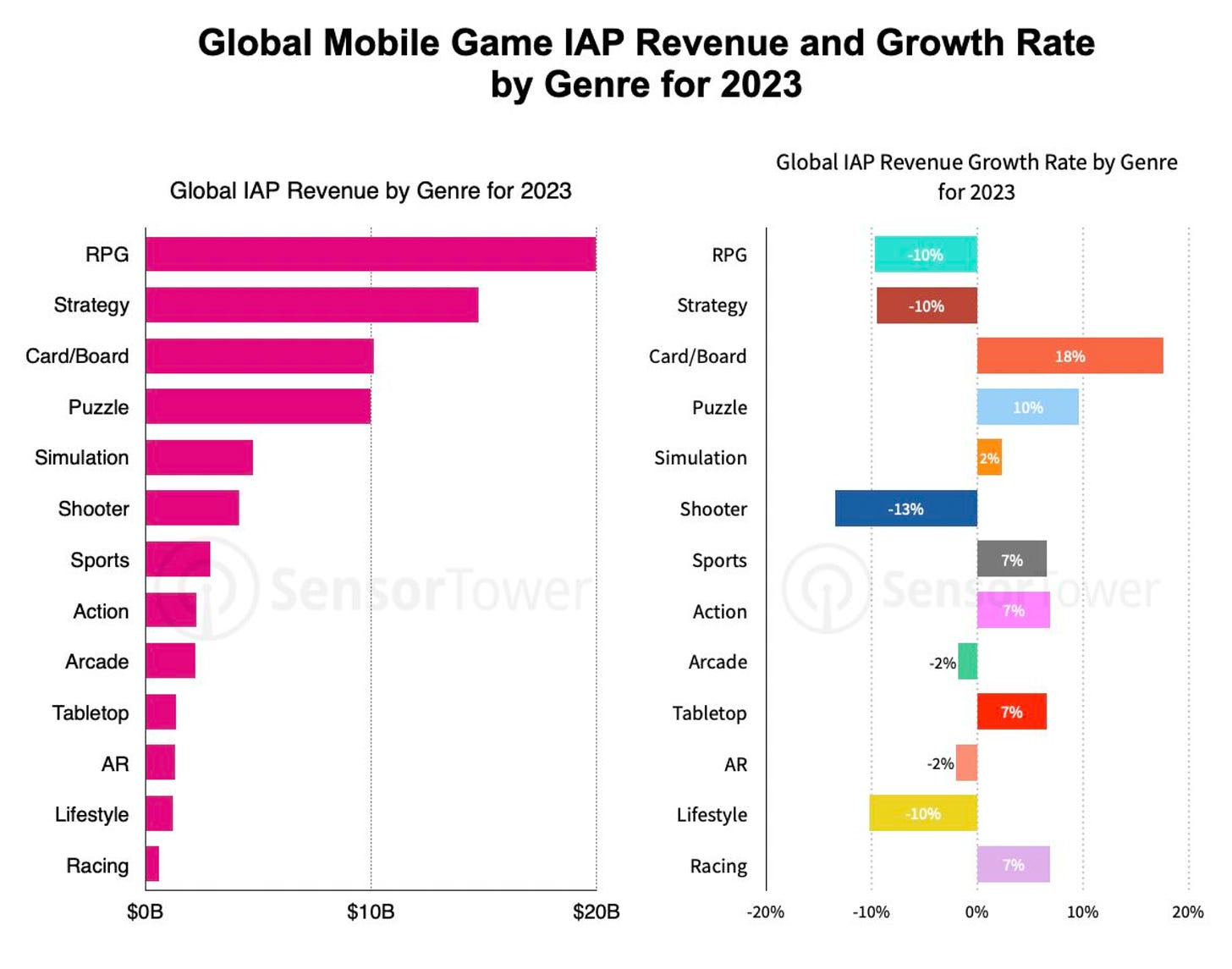 • RPG revenue continues to decline for the second consecutive year. The 10% drop worldwide is largely due to a 17% revenue decrease in Japan (the main market for the genre). However, declines were also seen in South Korea (-11% YoY), the USA (-7% YoY), Taiwan, Hong Kong, and Macau (-7%). In China, the iOS genre remained flat, with a decline of only 0.2% in 2023.