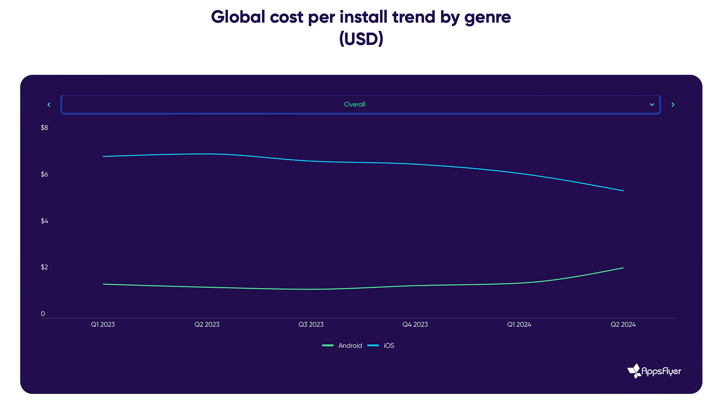 • One of the key trends in 2023 was the decrease in installation costs on iOS and the increase on Android. This was especially noticeable in puzzles, the Match genre, hyper-casual games, and the simulation genre.