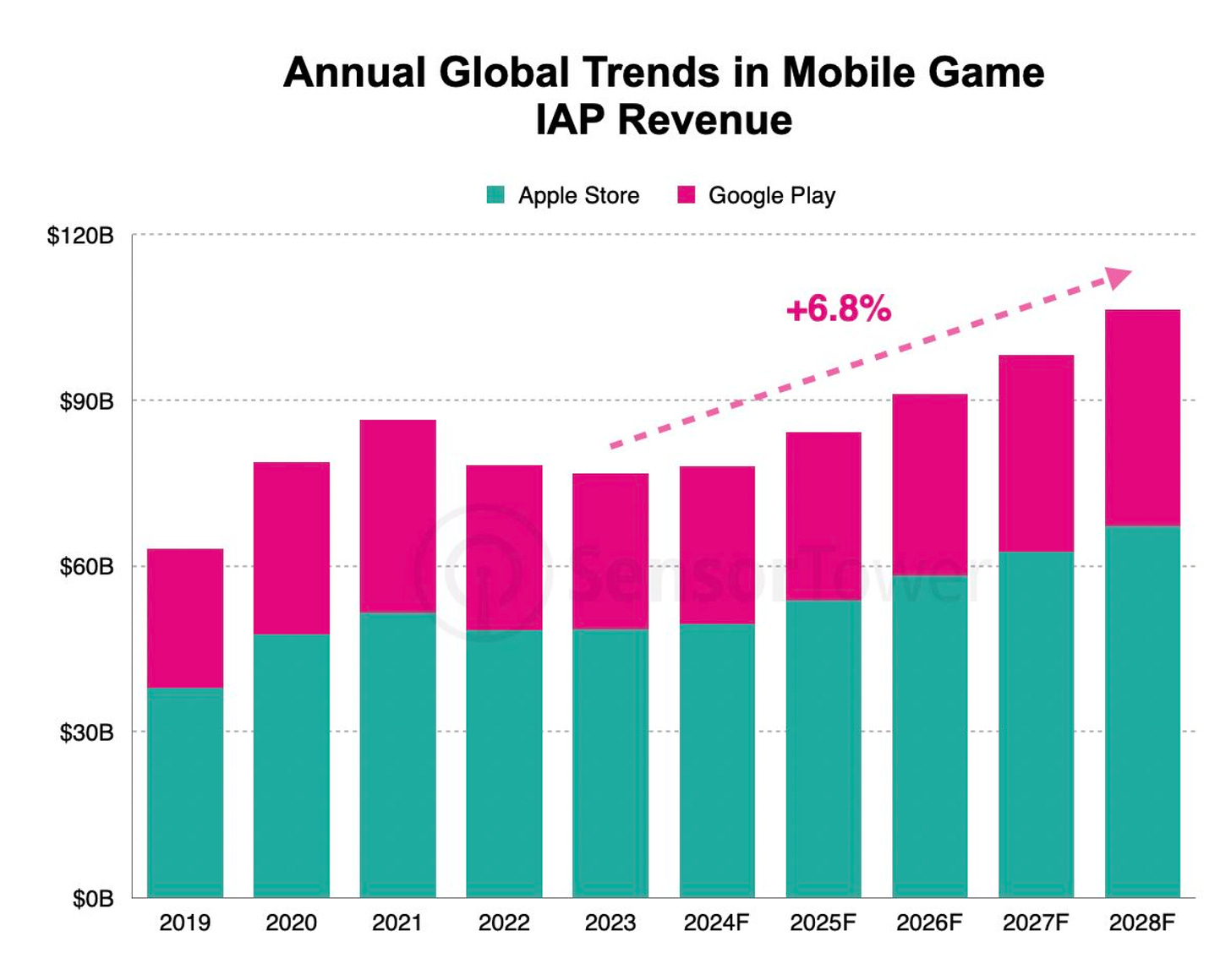 • Sensor Tower expects growth in 2024, with revenues reaching $78 billion (+1.6% YoY). By 2028, mobile game revenues are expected to exceed $100 billion, with a compound annual growth rate of 6.8%.