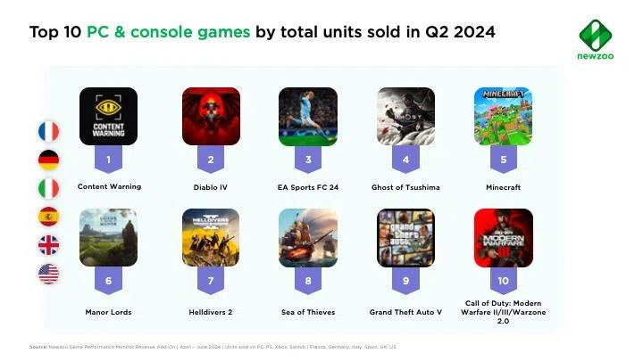 • Content Warning, Diablo IV, and EA Sports FC 24 were the leaders in the second quarter by the number of copies sold. However, it's not entirely clear if free copies of Content Warning were included. In any case, the game sold over 1.5 million copies across the six markets.
