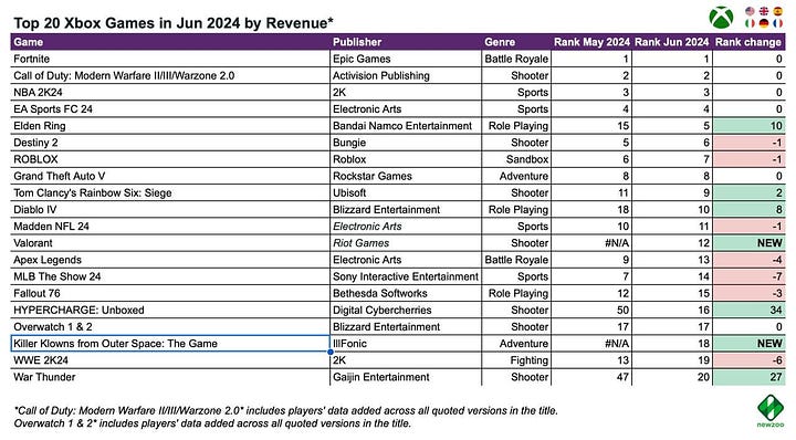 • On Xbox, Valorant and Killer Klowns from Outer Space: The Game (18th position) entered the top 20 by revenue for the first time. HYPERCHARGE: Unboxed and War Thunder showed strong revenue growth.
